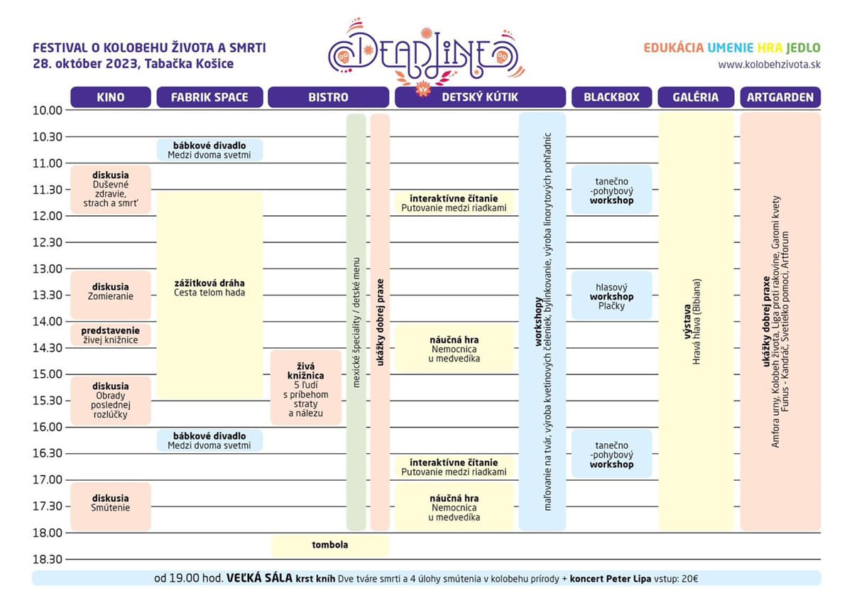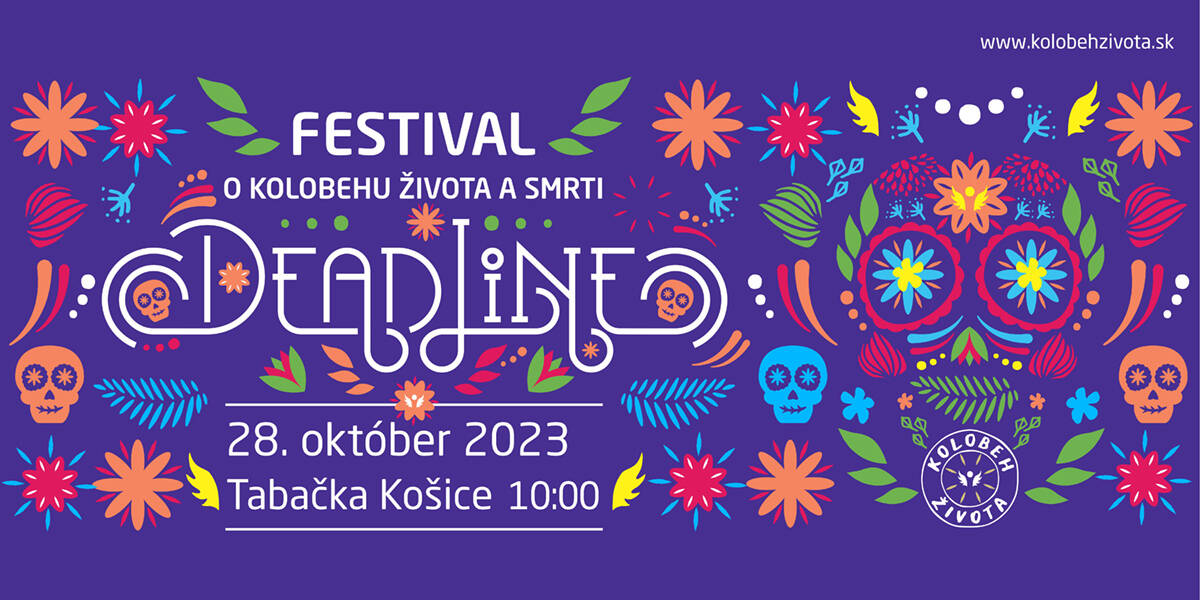 DEADLINE festival o kolobehu života a smrti, inšpirovaný mexickou kultúrou oslavy smrti, je prvý rodinný festival, ktorý chce komunikovať tabuizované a náročné témy súvisiace so zomieraním jemnou, láskavou, citlivou a rešpektujúcou rečou umenia a hry. Prijať stratu blízkeho nám pomôžu náročné témy, ktorým sa festival venuje v edukačnej sekcii. Môžete sa zúčastniť diskusií na tému zomieranie, smrť, rozlúčka a smútenie. Je to spôsob ako sprístupniť túto problematiku nielen dospelým, ale aj deťom. K tomu slúži aj jedlo, aby táto náročná problematika – stretnutie s našou smrteľnosťou – bolo stráviteľné pre všetkých. Odborníci v Kolobehu života, o.z. už 10 rokov sprevádzajú smútiacich po strate blízkeho. Spravujú tri veľké online svojpomocné skupiny pre ľudí po strate, s veľkým úspechom organizujú terapeutické pobyty a tábory, vydávajú rôzne publikácie. Charitatívne zamerané celodenné podujatie sa skutoční sa 28.10.2023 v košickej Tabačke.