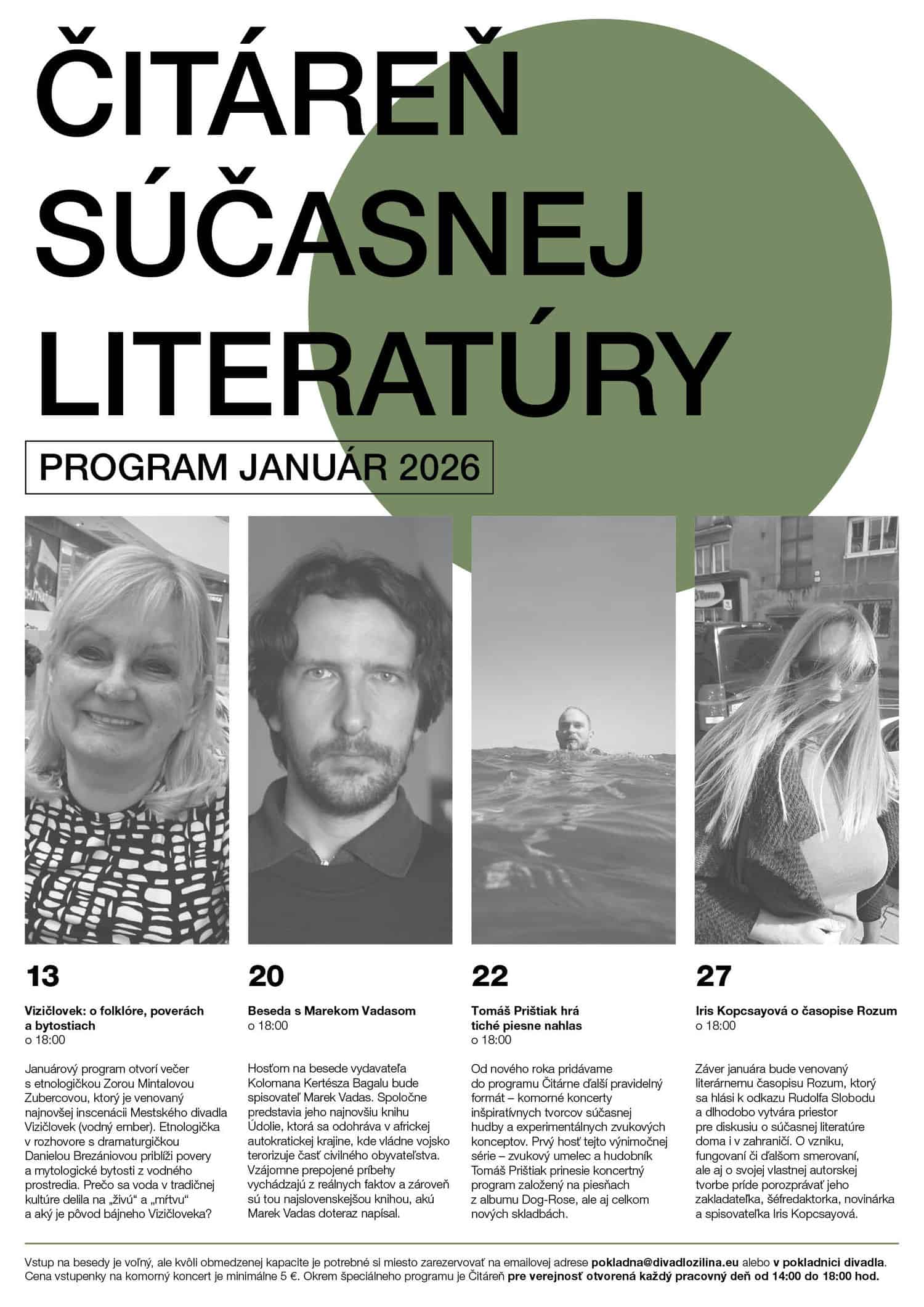 Vstup na besedy a diskusie v Čitárni súčasnej literatúry je naďalej voľný, avšak kvôli obmedzenej kapacite je potrebné si miesto zarezervovať na emailovej adrese pokladna@divadlozilina.eu alebo priamo v pokladnici divadla.