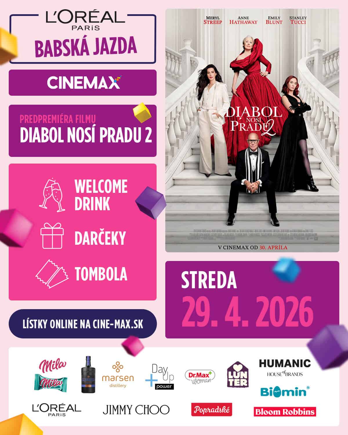 Koncom mesiaca sa na plátna vracia aj ďalší kultový titul. Diabol nosí Prada 2! Takmer po 20 rokoch sa do svojich ikonických rolí vracajú Meryl Streep, Anne Hathaway, Emily Blunt a Stanley Tucci. Film si môžete vychutnať aj v rámci obľúbenej Babskej jazdy 29. apríla, kde nebude chýbať welcome drink, originálne darčeky, tombola ani jedinečná atmosféra.