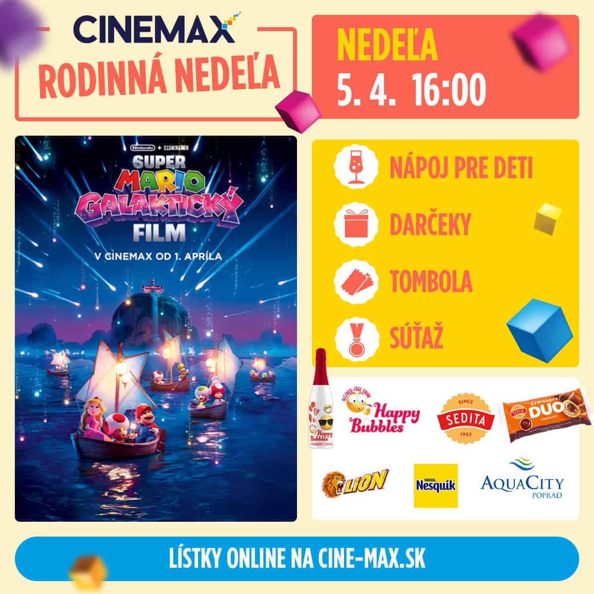 Na začiatok mesiaca sa môžu tešiť najmä rodiny s deťmi. Do kín prichádza pokračovanie obľúbeného hrdinu v snímke Super Mario galaktický film. Mario a Luigi síce zachránili princeznú Peach, no ich dobrodružstvo zďaleka nekončí. Očakávajte opäť super dvojicu a akčnú zábavu. Film Super Mario galaktický film si budú môcť diváci vychutnať aj počas Rodinnej nedele, a to 5. apríla o 16 hod. vo všetkých kinách CINEMAX, kde ich čaká bublinkový nealko drink, skvelé darčeky, tombola a skvelá atmosféra.
