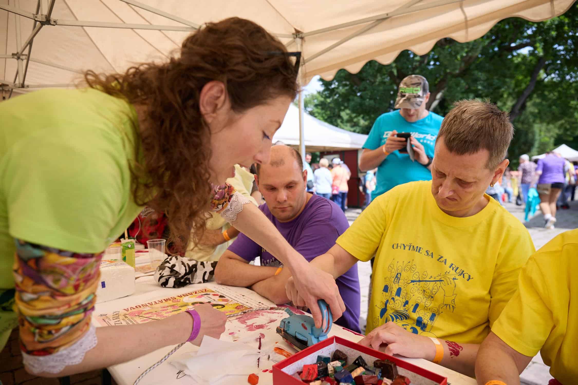 Prípravy na „oslavu“ sa začali už v sobotu na poludnie. Taký priestor nie je hračka. Chlapci dobrovoľníci sa štverali. Raz hore na rebrík, potom dolu z rebríka, aby umiestnili na tie správne miesta veľké bannery. Na chvíľu prerušil práce dážď. A pokračujeme. Dievčatá si nachystali pod veľkým stanom stoly, stoličky. A môže sa ísť oddýchnuť. Zajtra ráno nás čaká ešte kopec práce. V nedeľu od rána znova dobrovoľníci kmitali po nádvorí. Pripraviť miesto pre občerstvenie. Tu budú kreatívne dielne. Na čo sa v nich môžeme tešiť tento rok? Enkaustika – maľba horúcim voskom. Maľovanie na plátna. Maľovanie na sadrové odliatky. Maľovanie na tvár a tetovačky na ruky. Je z čoho vybrať. Stoly pre farebné tričká. Pripraviť pódium. Zvukovky. Kameraman a fotografi nachystaní. Aj všetci ostatní. Možeme púšťať.