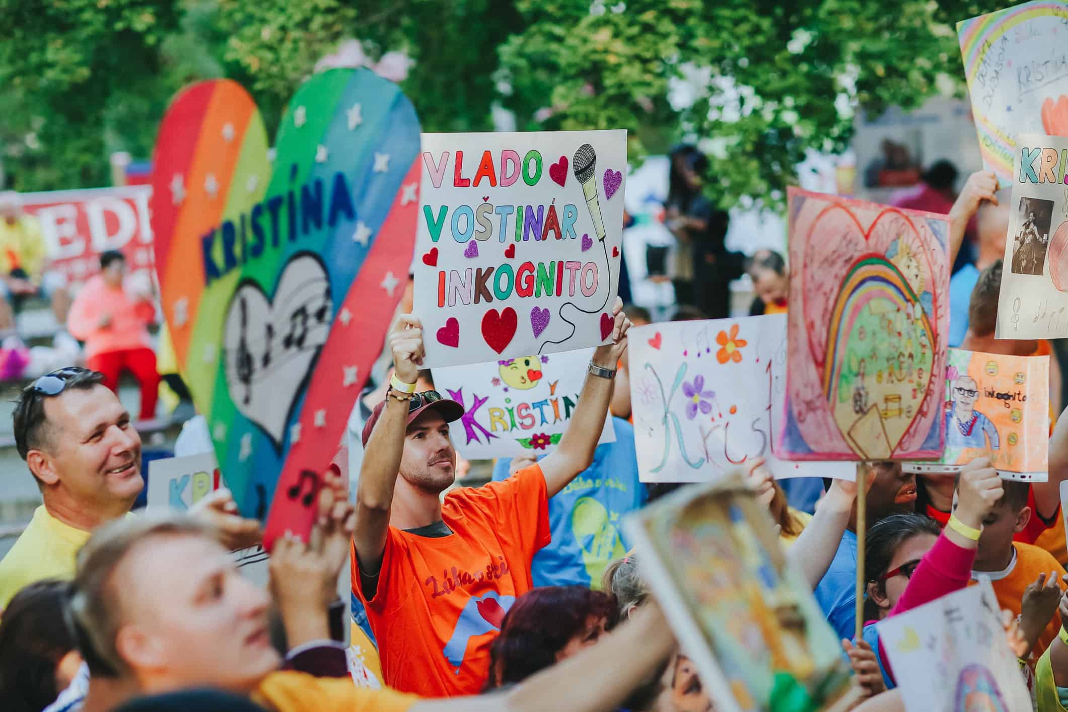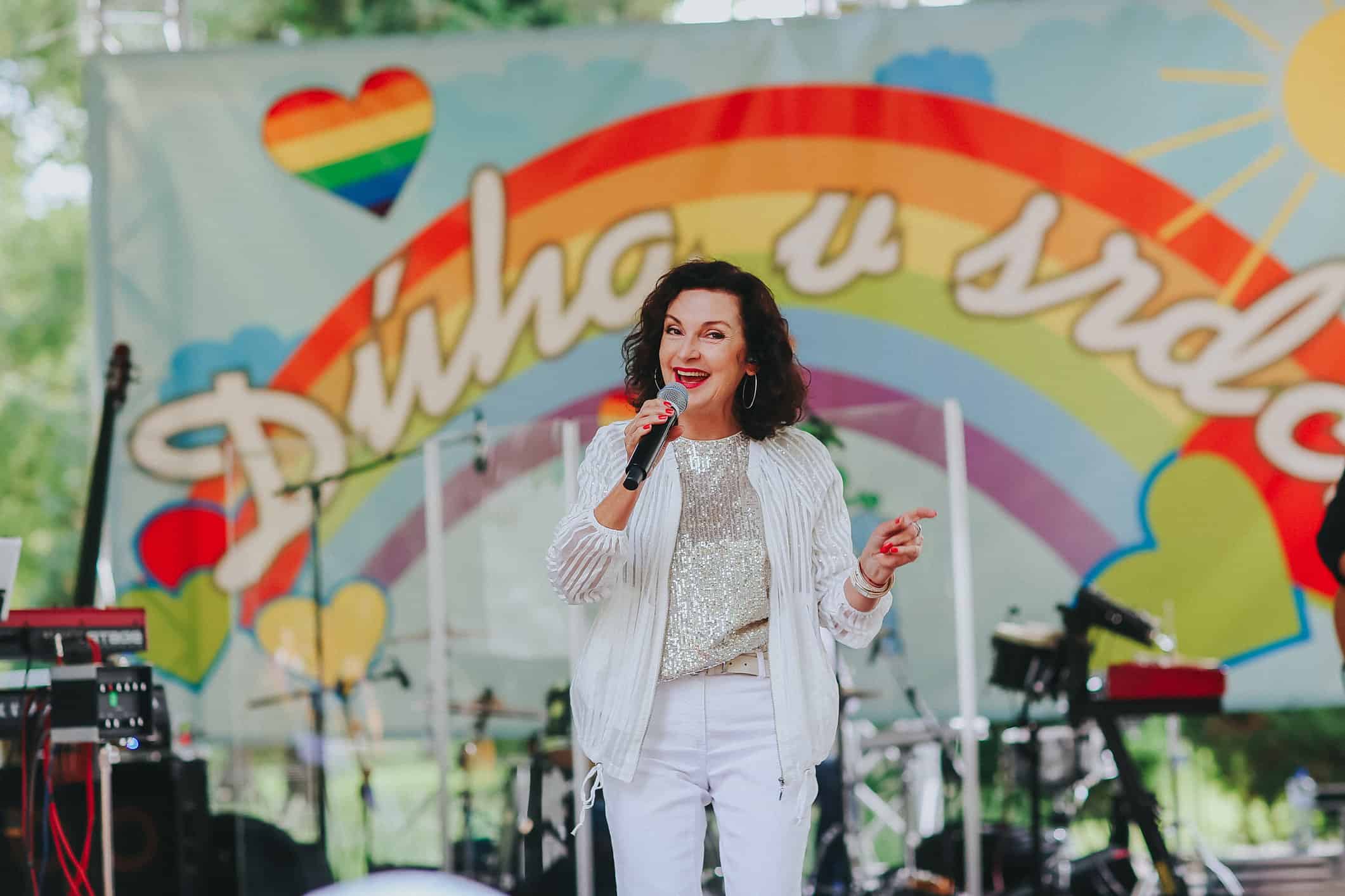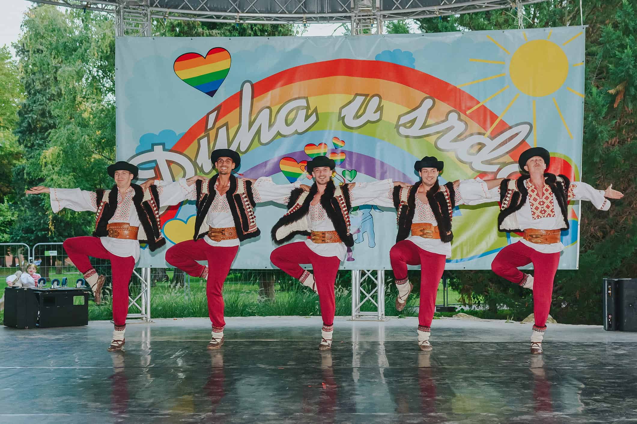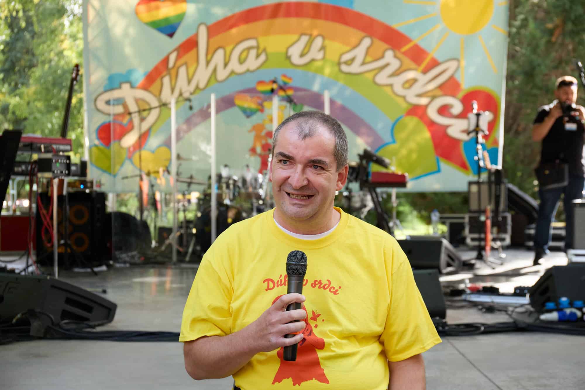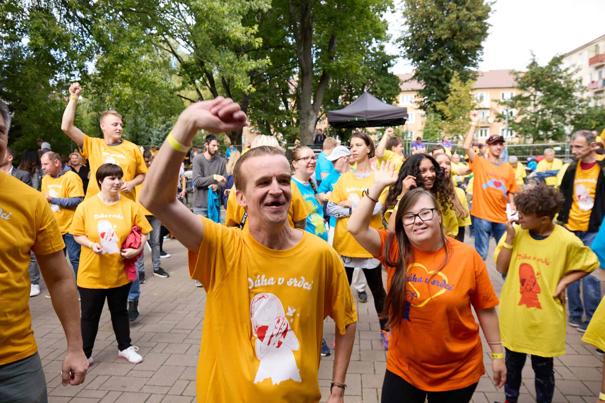 Obliecť farebné tričká. Z pódia sa už prihovára Vlado Voštinár. Poznáte ho z televízie. Dnes nám neprišiel dávať otázky o povolaniach. Ani ponúknuť nové bývanie. Dnes má v ruke moderátorský mikrofón Dúhy v srdci. Prichádza s ním i prvý účinkujúci. Zumba Zoly. Čo to bude? Hudba, tanec. Horúce latino rytmi. Už viackrát prijal pozvanie na podujatia Milana Štefánika. „Nové Mesto nad Váhom som už druhý krát, a úplne že super atmosféra. Je to už viacerý krát a každý krát je to fantastická atmosféra.“ Na pódiu som sa k Zolymu pridala aj ja. „Inak obdarených“ sme vtiahli do víru tanca nielen s latino piesňami. Na rad prišli i slovenská, česká a maďarská. Temperament sa Zolymu nedá uprieť. Ladné pohyby. Kroky vpred. Kroky vzad. Pridáme ruky nad hlavu. Zatlieskame. Otočka a výskok. Energia sa rozprúdila a pod pódiom už neostalo ani miesto voľné. Veľa farebných tancujúcich tričiek. Páčilo sa vám to? „Dobre sme sa tu mali. Zabávali sa. Užívali sme si atmosféru. A je to príjemné.“ Tak si pridáme ešte jednu. Spoločné foto.