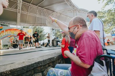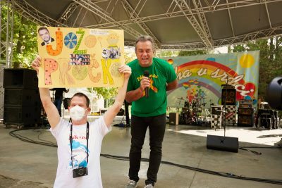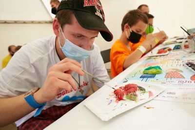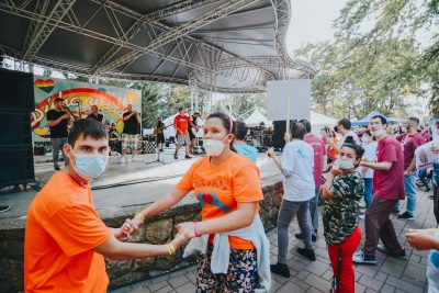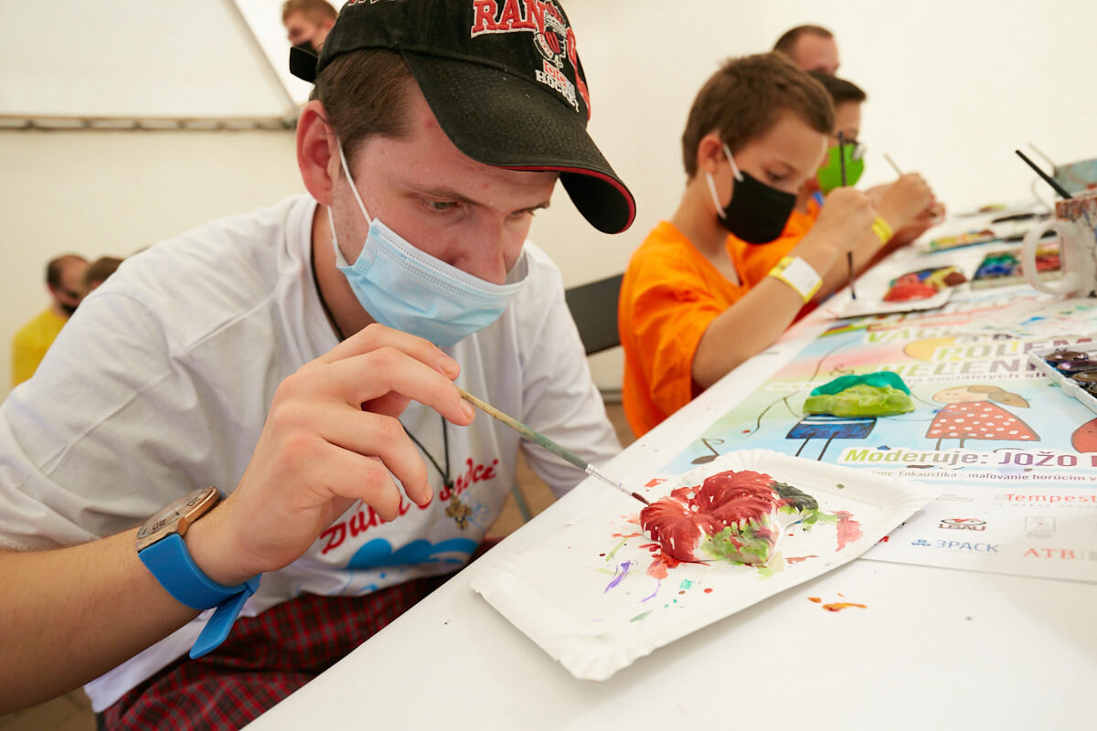 Slnečné lúče sa od rána odrážali od farebných jesenných listov a po parku už pobehovali dobrovoľníci. Veď pred začiatkom vystúpení je potrebné ešte veľa spraviť. Postaviť stany. Pripraviť stoly. Nachystať občerstvenie. Rozložiť materiál do kreatívnych dielní. A to najdôležitejšie – pódium. Aparatúra. Zvukársky pult. Mikrofóny. Rozvešať bezpečnostné opatrenia. Pripraviť stojan s dezinfekciou. Farebné tričká pre „inak obdarených“. A môžeme začať. Vpravo stánok s občerstvením. Vľavo kreatívne dielne. Enkaustika. Maľovanie na sadrové odliatky. Či farebné ornamenty maľované na ruky. To všetko si môžete skúsiť.