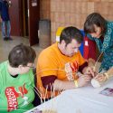 Ale pekne po poriadku. Na takú oslavu treba všetko pripraviť. Od rána preto v priestoroch kmitali dobrovoľníci. Nosili a prekladali. Vyberali z krabíc. Lepili. Zapájali. Hudobné nástroje. Mikrofóny. Miesto pre občerstvenie. Ešte stoly pre kreatívne dielne. Na čo sa môžu dnes návštevníci tešiť? Je z čoho vyberať. Enkaustika – maľovanie horúcim voskom. Maľovanie na sadrové odliatky. Prútikárstvo. Maľovanie na tvár. Posledné úpravy. Pripraviť farebné tričká. A aj slniečko prenikajúce cez okná podporilo krásnu myšlienku podujatia: Darovať hudobný zážitok „inak obdareným“.
