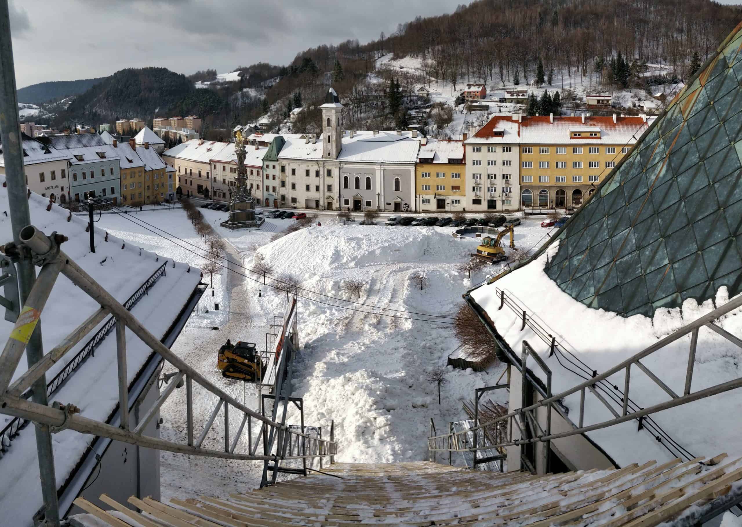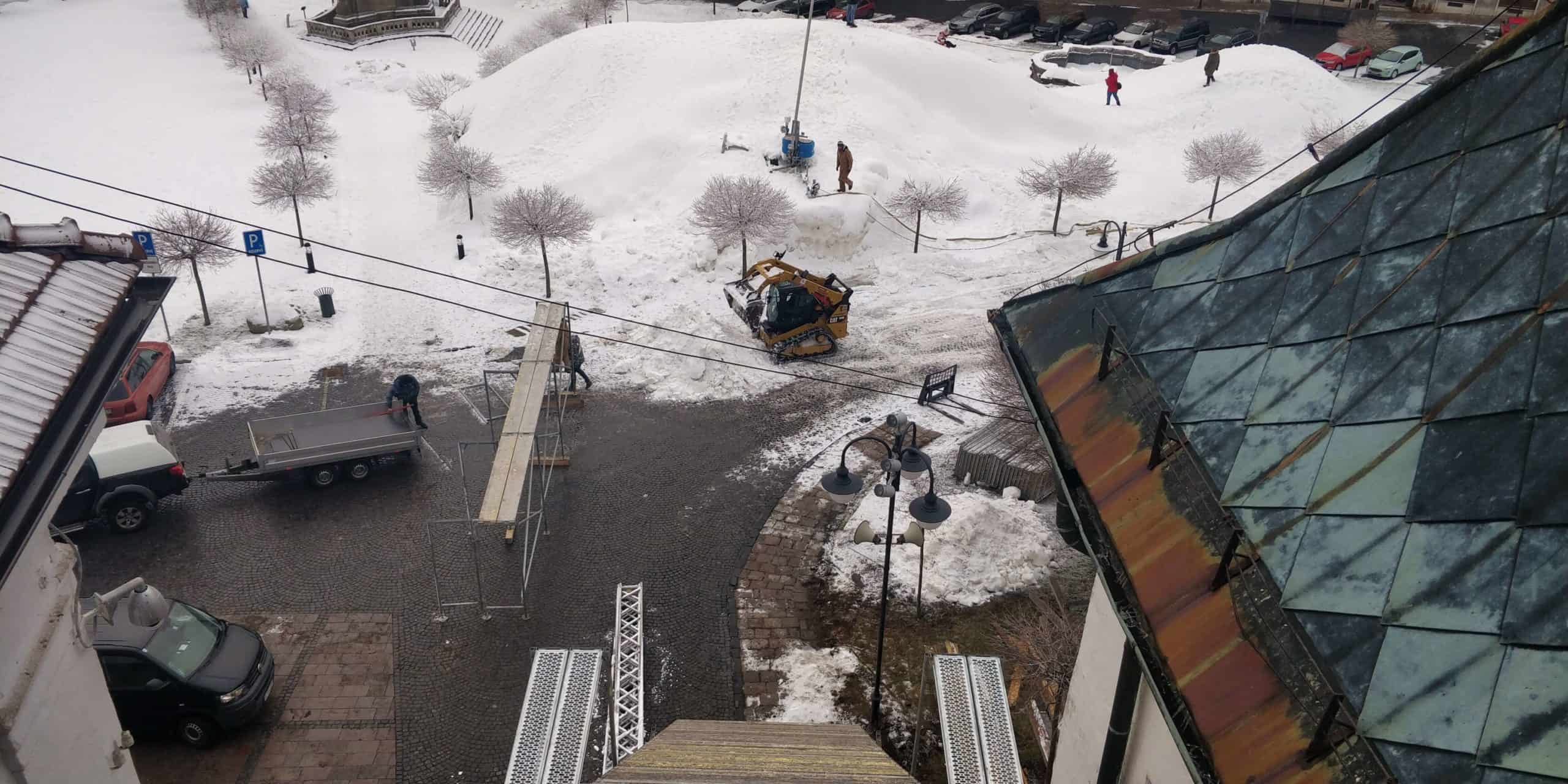 „Námestie sme s prestávkami od Vianoc zasnežovali s pomocou jedného vlastného a jedného zapožičaného snežného dela. Aby sme za týždeň o sneh neprišli, skok zakryjeme, aby sa udržal,“ dopĺňa Ondrej.