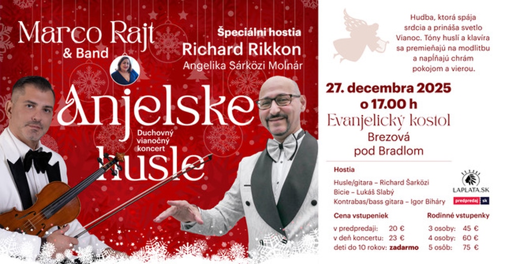 V predvianočnom období, keď sa dni naplnia pokojom a svetlom, pripravuje La Plata Production výnimočný hudobný večer. Dňa 27. decembra 2025 sa v Evanjelickom kostole v Brezovej pod Bradlom rozozvučia tóny koncertu Marco Rajt & band feat. Richard Rikkon – Anjelské husle, ktorý prinesie návštevníkom chvíle pokoja, radosti a hudobnej meditácie.