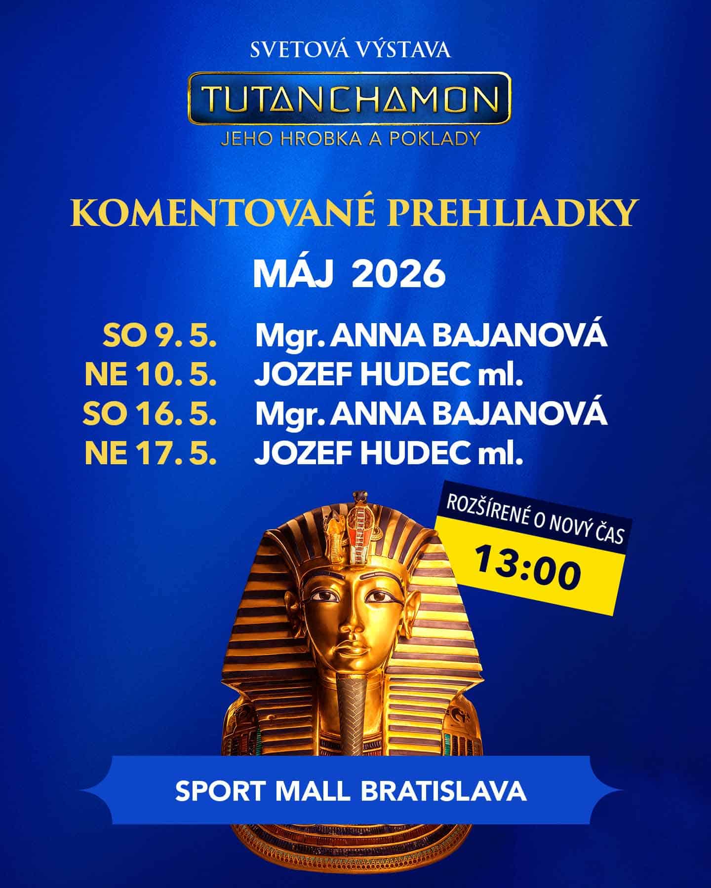 Výstava Tutanchamon – jeho hrobka a poklady reaguje na veľký záujem verejnosti a rozširuje ponuku komentovaných prehliadok aj počas mesiaca máj. Návštevníci si tak môžu jedinečný príbeh jedného z najznámejších panovníkov starovekého Egypta vychutnať ešte intenzívnejšie – v sprievode odborníkov, ktorí odhaľujú súvislosti, symboliku aj fascinujúce detaily jednotlivých exponátov.
