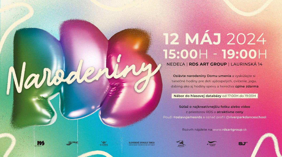 Dom umenia RDS ART Group má dôvod na oslavu! V nedeľu 12. mája slávi svoje narodeniny a pozýva všetkých na nezabudnuteľnú oslavu plnú tanca a spevu. Príďte na Laurinskú 14 do centra Bratislavy a užite si otvorené hodiny tanca, spevu a herectva úplne zadarmo! Od 15:00 do 19:00 hodiny čaká na všetkých bohatý program, ktorý si užijú deti aj dospelí!