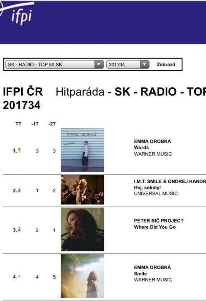 Ak v týchto dňoch niektorej zo slovenských speváčok stúpa hviezda, tak je to Emma Drobná. Jej druhý singel Words je aktuálne najhranejšou skladbou slovenského rádiového éteru. Len o tri priečky pod ním sa pri tom stále drží Emmin debutový singel Smile: