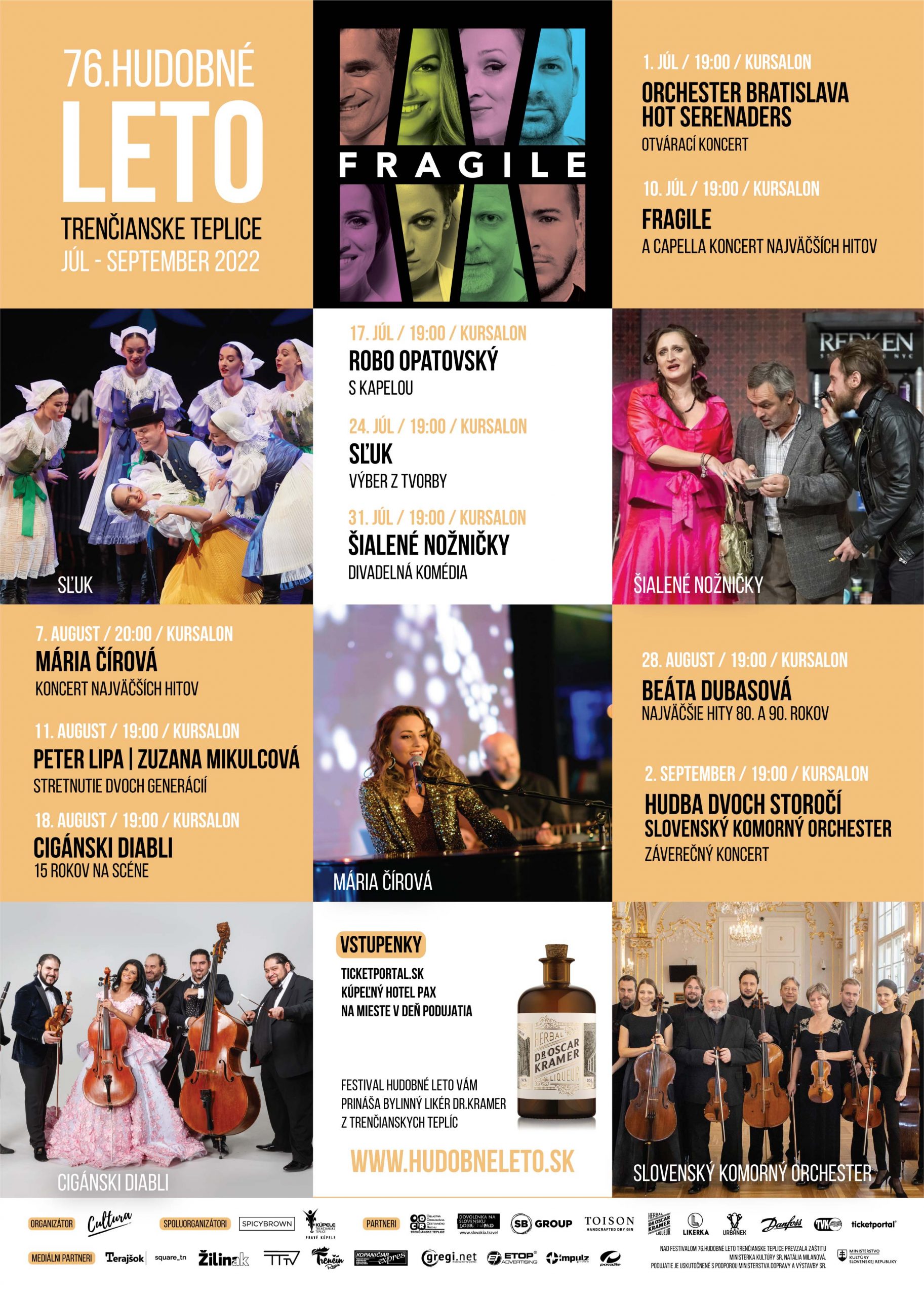 Júlový program Hudobného leta bude pokračovať A cappella koncertom najväčších hitov úspešnej slovenskej vokálnej skupiny FRAGILE, ktorá s ľahkosťou, nadhľadom i svojím typickým humorom predvedie svetové skladby bez sprievodu hudobných nástrojov. Robo Opatovský s kapelou nás naladí na svoje romantické songy i rytmické piesne, plné energie, ale aj osobných spovedí. O týždeň neskôr sa ocitneme vo víre ľudových tancov s nezabudnuteľnými folklórnymi choreografiami SĽUK-u s názvom Výber z tvorby, ktoré budú mapovať ľudové zvyklosti naprieč celým Slovenskom. Posledná júlová nedeľa bude patriť divadelnej komédii Šialené nožničky z dielne bratislavského Hudobného divadla Teatro Wüstenrot. Čakajú nás bláznivé situácie, neočakávané rozuzlenia a pointy, ale tiež jedinečná konverzačná herecká improvizácia, ktorú spoluvytvárajú samotní diváci.