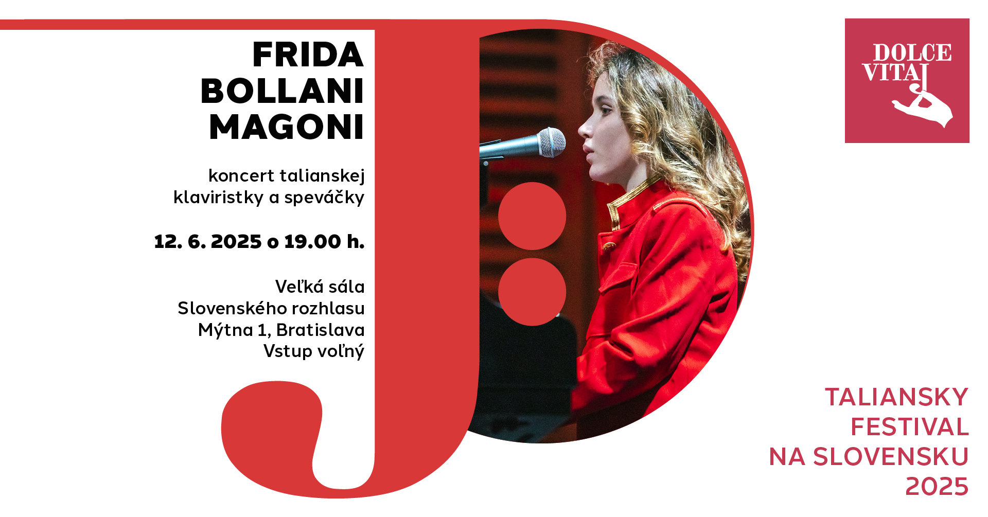 Frida Bollani Magoni vystúpi 12. 6. 2025 o 19.00 h. vo Veľkej sále Slovenského rozhlasu na Mýtnej 1 v Bratislave.  Vstup na podujatie je voľný až do naplnenia kapacity sály.