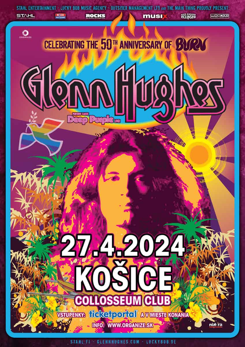 … ale áno, jasné ! Rockový spevák a basgitarista, nazývaný aj „hlasom rocku“, ktorý pôsobil aj v najznámejších rockových/metalových legendách. Najväčšie boli Black Sabbath a Deep Purple. Deep Purple boli istého času najpredávanejšia kapela na svete (veď ich celosvetové predaje sú cez 150 000 000 albumov) a Black Sabbath ? K tomu snáď netreba komentár. Album Burn od Deep Purple oslavuje 50 rokov a s ním aj spevák a basgitarista, ktorý ho nahral a naspieval ! V tom čase tvorili kapelu aj sólový spevák, mladučký a vtedy neznámy David Coverdale, Ritchie Blackmore na gitare, Jon Lord na klávesoch, a Ian Paice na bicích. Neuveriteľné, že aj po takom čase si budeme môcť vypočuť celý tento album naživo – exkluzívne v Košiciach, 27.4. – v podaní legendy hard rocku, Glenna Hughesa !