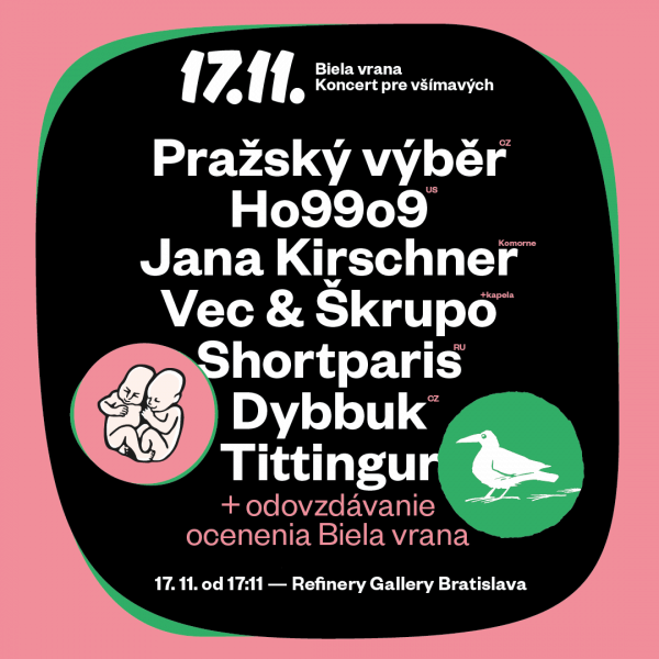 Do Bratislavy prídu aj legendárne, komunistami zakázané kapely Pražský výběr a Dybbuk či ruská kapela Shortparis, ktorej vystúpenie označila šéfka Talinn Music Week za jeden z najpamätnejších koncertov festivalu. Z domácich hviezd vystúpia Jana Kirschner so sláčikovým kvartetom, Vec s kapelou či jeden z „klubových“ objavov Pohody 2017 Tittingur hrajúci tzv. maximal techno. Koncert bude tentokrát pod jednou strechou s partnerským Večerom bielych vrán. Jeho súčasťou bude odovzdávanie ocenení za občiansku statočnosť i hudobné vystúpenia. Lístky na Večer bielych vrán či spoločnú vstupenku na obe akcie si môžete kúpiť od pondelka 29. októbra v shope na webstránke Pohody.