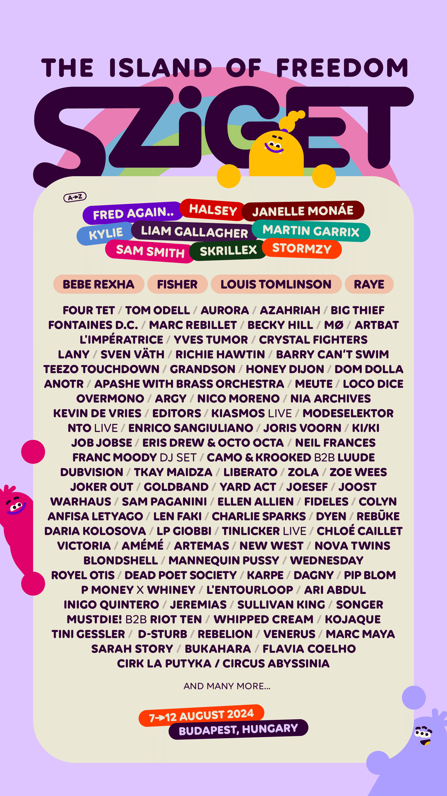 Line-up Szigetu je aj tento rok nabitý až po okraj svetovými hviezdami a skvelou hudbou. Na hlavnom pódiu sa predstavia aj Fred Again.., Halsey, Kylie Minogue, Liam Gallagher, Martin Garrix, Sam Smith, Skrillex, Stormzy, RAYE, Tom Odell, Fisher. Skvelý program však ponúka aj obrovský červený stan Revolut stage s menami ako Four Tet, Aurora, Big Thief, Fontaines D.C., Marc Rebillet, Crystal Fighters. Kroky fanúšikov elektronickej hudby budú určite smerovať do unikátneho Colossea, ktoré je špeciálne nadizajnované pre Sziget zo stoviek drevených paliet či Párty Arény, kde program končí až do 6:00. O skvelú párty sa postarajú medzi inými aj ARTBAT, Sven Väth, Honey Dijon, Richie Hawtin.