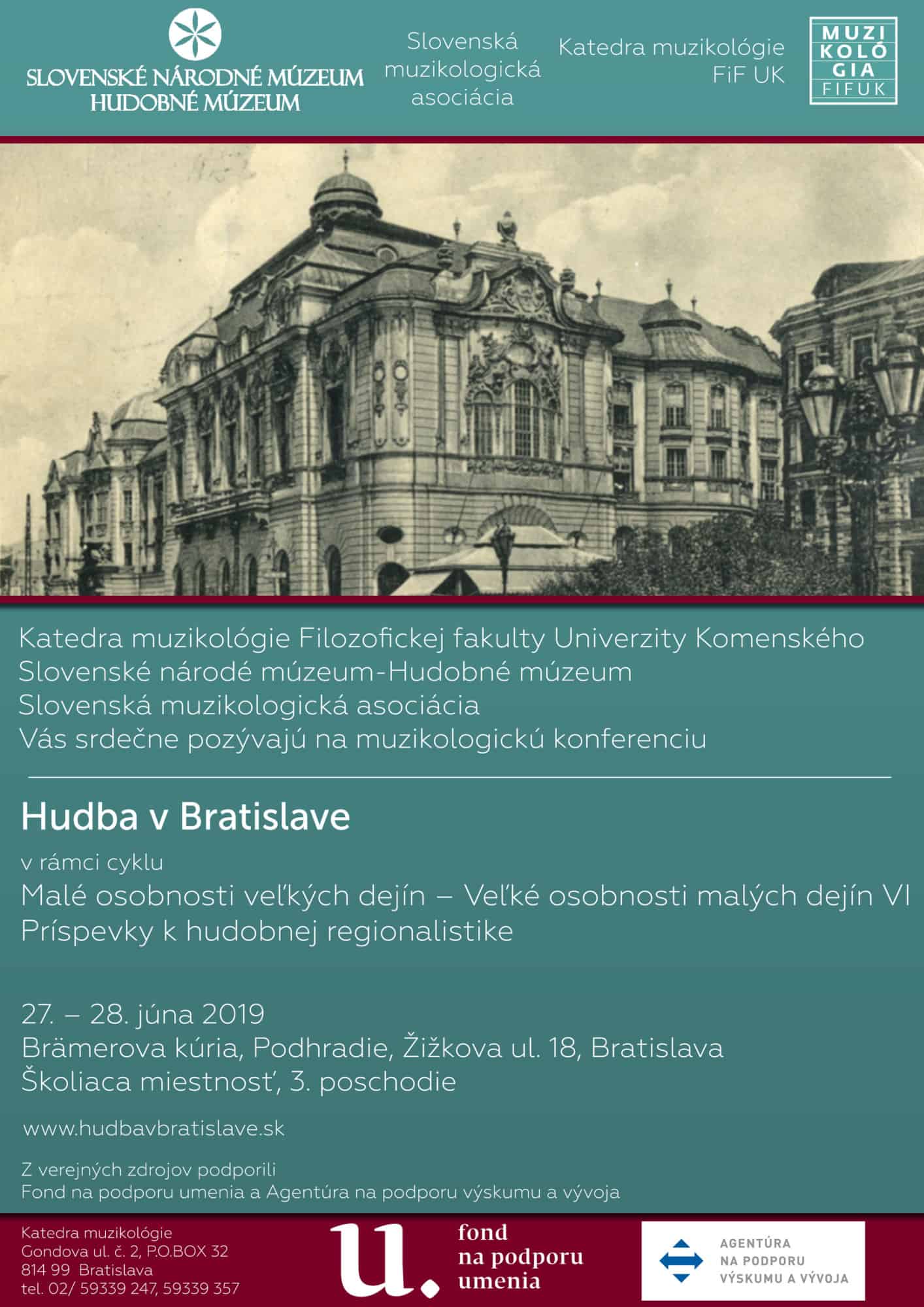 SNM-Hudobné múzeum pripravilo spolu s Katedrou muzikológie Filozofickej fakulty Univerzity Komenského a v spolupráci so Slovenskou muzikologickou asociáciou muzikologickú konferenciu s názvom Hudba v Bratislave v rámci cyklu konferencií Malé osobnosti veľkých dejín – veľké osobnosti malých dejín / Príspevky k hudobnej regionalistike. Podujatie sa uskutoční v dňoch 27.6. – 28.6.2019 v Brämerovej kúrii na Žižkovej ulici č. 18 v Bratislave.