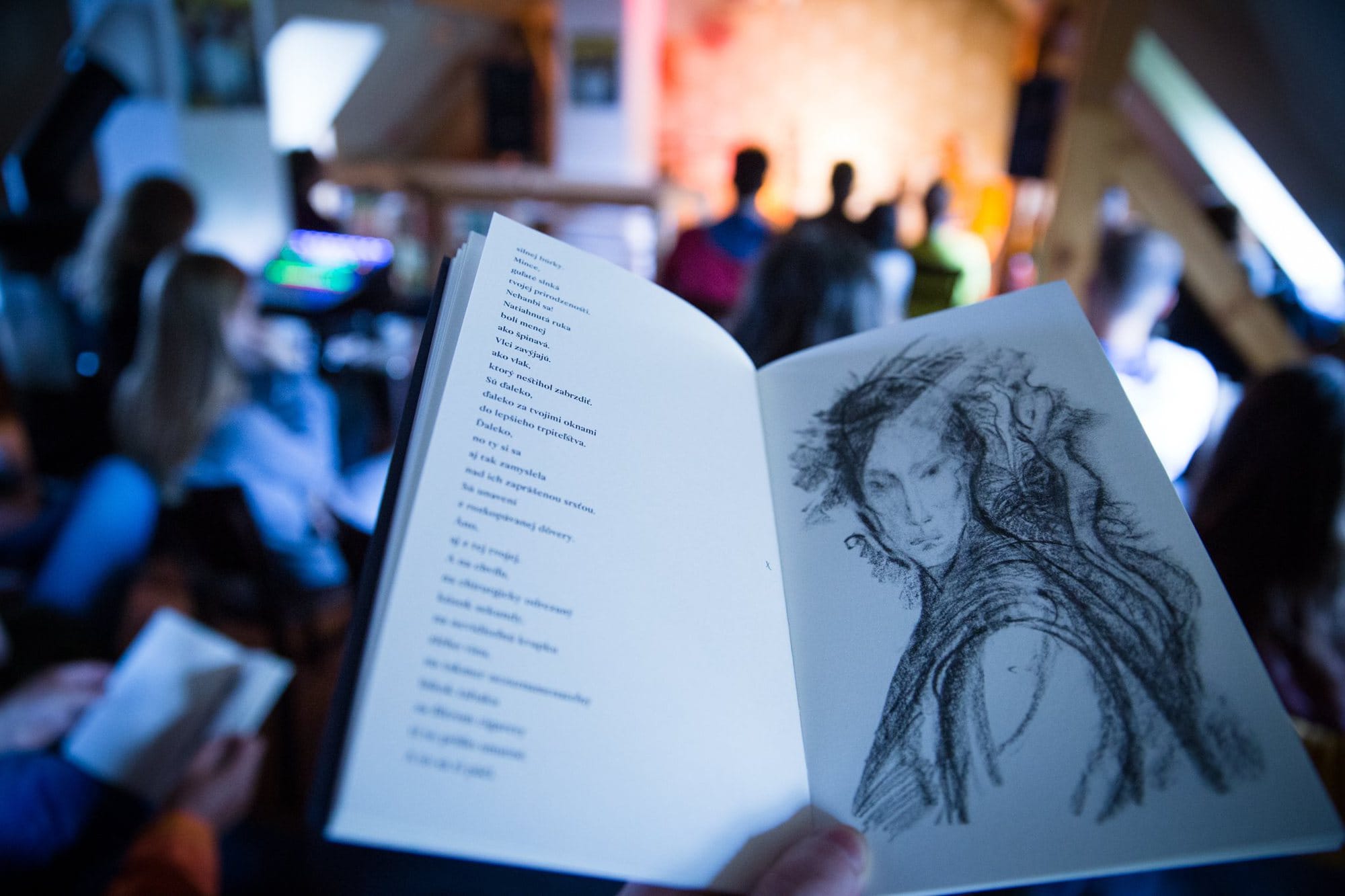 Dážď nám nezabránil odskočiť si do Art Cafe na čítačku. Tu už Robo Pospiš s moderátorskou podporou Dianky Mašlejovej prezentoval novú básnicko-výtvarnú zbierku Ukazuješ do tmy, vidím svetlo. Autorom kresieb je jeho dlhoročný priateľ, hudobník a výtvarník Roman Harvan. Okrem slov zazneli aj hudobné úryvky v podaní Roba Pospiša.
