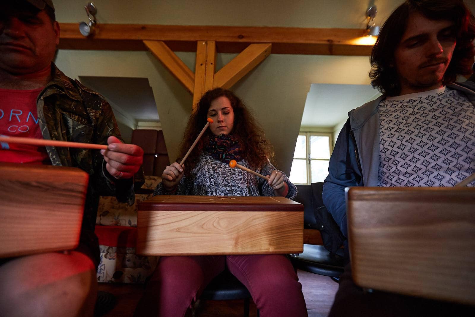 Do podkrovia sme sa vrátili o štvrtej poobede. Hudobník Boris Čellár priviedol so sebou do Štiavnice špičkových slovenských bubeníkov a perkusionistov Miša Fedora, Javora a Eddyho Portellu. Prírodný meditatívny zvuk WoodPacku doplnený o relaxačné zvuky gitary rôznych perkusií či slnečného bubna a elektroniky. Jedinečný koncert zvukov napojených na iné sféry vnímania. WoodPack Brothers na našom festivale. Nadšenci intuitívneho hudobného nástroja ostali po koncerte a rozozvučili spolu s Borisom v podkroví hneď niekoľko Woodpackov naraz. Hudba spojila ľudí aj bez slov.