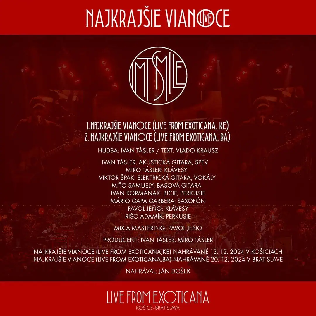 Skupina IMT Smile prináša fanúšikom jedinečný vianočný darček v podobe live verzie piesne „Najkrajšie Vianoce“, ktorá vznikla na výnimočných koncertoch Exoticana v roku 2024. Pieseň vychádza v dvoch verziách. Z koncertu v Košiciach a v Bratislave.