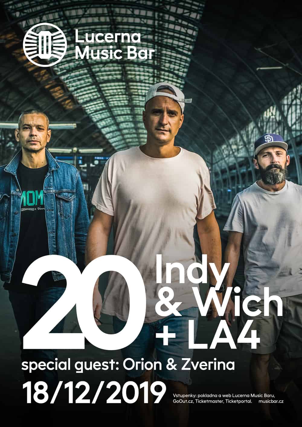 Společně s Indym, Wichem a LA4 se v Lucerna Music Baru představí dvě velké osobnosti česko-slovenského hiphopu. Na kruhovém pódiu nemůže chybět Orion, který v začátcích kapele hodně pomohl. Uslyšíte tak staré legendární věci jako Cesta štrýtu, Hlasuju proti a další společné skladby. Slovenskou scénu bude reprezentovat Zverina. Indy a Wich se nechali slyšet, že v roce 2020 bude pražských koncertů pomálu, tak si nenechte jejich speciální výroční show se speciálními hosty ujít.