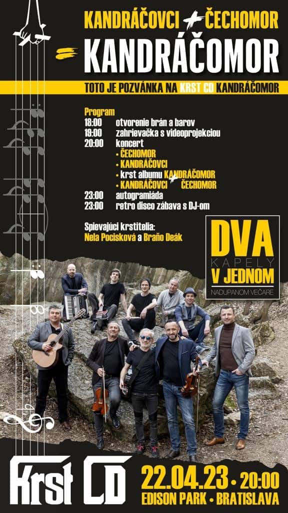Kapely Kandráčovci a Čechomor v roku 2022 spojili svoje sily a prvýkrát vyrazili na spoločné Česko-slovenské turné. Po obrovskom úspechu sa rozhodli v spolupráci pokračovať a tohtoročné leto opäť strávia v spoločnosti svojich fanúšikov. Skôr než vyrazia do jednotlivých slovenských miest, odpália zábavu na veľkolepom krste v hlavnom meste, na ktorom pokrstia spoločný album KANDRÁČOMOR.