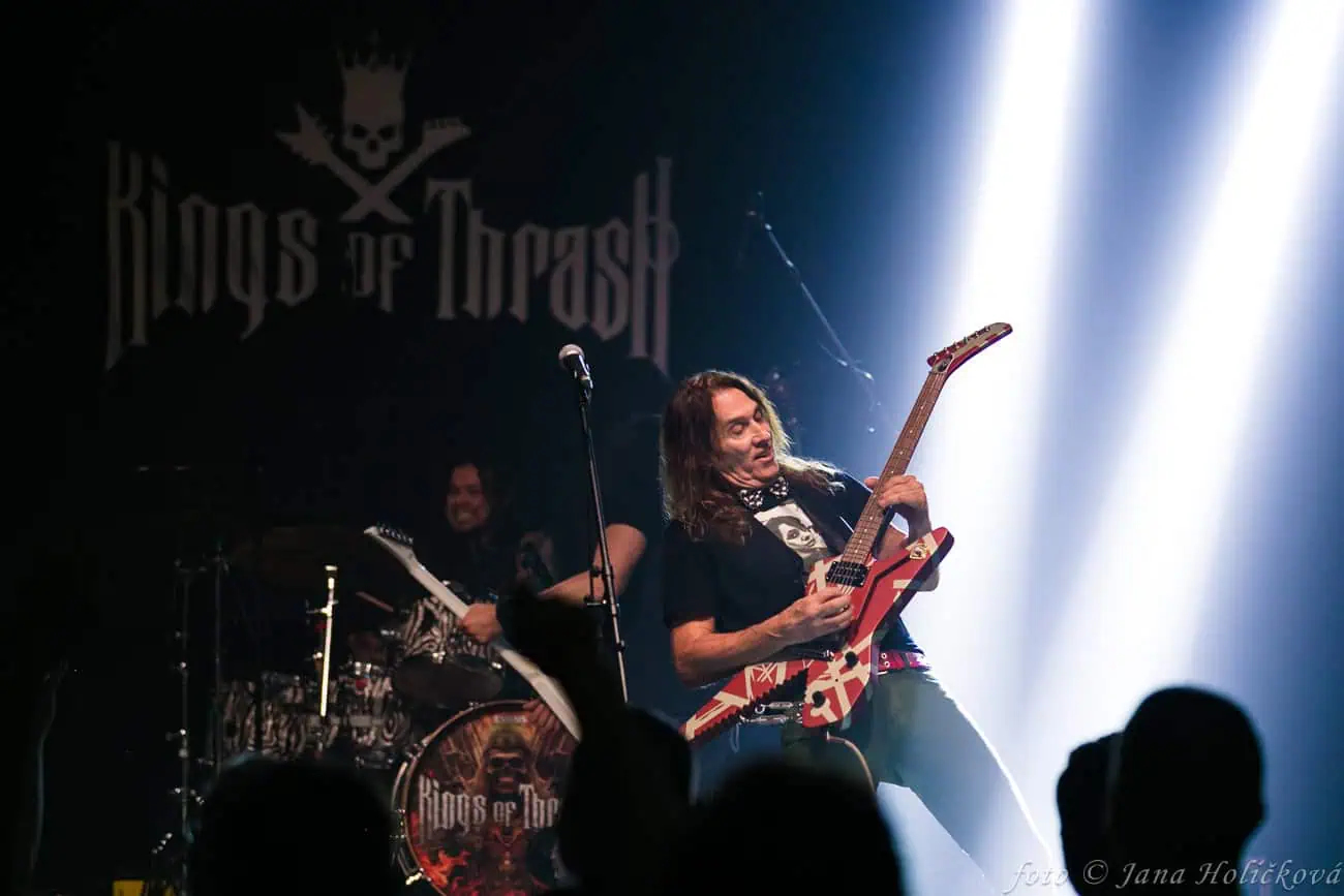 Jeff sa s Daveom znovu zišli po dlhých 35 rokoch. Do novosformovanej „spomienkovej“ kapely KINGS OF THRASH si prizvali speváka a gitaristu Chaza Leona a bubeníka Freda Achinga. V rámci reklamy na koncert kapely sa sľubovalo to najlepšie z klasických albumov MEGADETH. Okolo desiatej hodiny sa rozozvučali prvé tóny pochodového intra „Into Lungs of Hell“ a kapela pomaly napochodovala na pódiu. 62-ročný sólový gitarista Jeff Young s legendárnou gitarou The Ibanez Destroyer zvanou „The Shark“ upravenou a autorizovanou gitarovým novátorom Eddie Van Halenom, predvádza, čo sa za tie roky naučil a nezabudol – rýchle, melodické a originálne poňaté sóla. Ako posledný prichádza hlavná hviezda večera, 59-ročný Dave Ellefson s autorskou sériovou basou, ikonickou sivou Bass CBX IV | Jackson. Páni muzikanti nezabudli nič zo svojho majstrovstva a po hranom intre prišla na rad prvá spievaná, nádherne ťahavá „Mary Jane“. Kapela pokračuje spomienkou na 30-ročný album Youthanasia s hitovkou „Train Of Consequences“ s výborným melodickým refrénom a po nej menej známou, údernou „Victory“. Späť k albumu So Far…a „groovie valec“ v podobe skladby „Liar“, s typickým Mustainovým frázovaním „cez zuby“. Spevák a gitaristu Chaza Leona zvládal svoj post dôstojne a to nielen výzorom, kedy mal v rukách gitaru „striebornú šípku“ ala Dave Mustaine, ale aj jeho nie až tak zložitý, ale skôr osobitý spevácky prejav. Skladba končí bubeníckym sólom Freda Achinga, kde ukázal svoju bubenícku rýchlosť, ale aj slušnú technickú úroveň.
