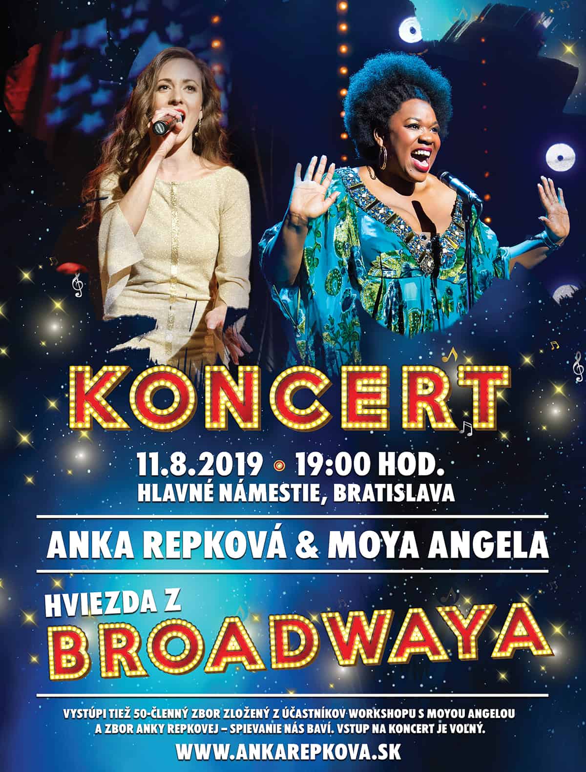 Speváčka, autorka, herečka a hlasová koučka Anka Repková, známa z muzikálov Vlasy, Rocky Horror Show, Rebelové, TV Show Let’s Dance a Bailando. A spolu s ňou americká speváčka, herečka a hlasová koučka, hviezda z Broadwaya a semifinalistka súťaže „Amerika má talent“: Moya Angela. – Obe vystúpia 11.8. na Hlavnom námestí v Bratislave. Ide o ich prvý spoločný koncert a Moyino prvé vystúpenie na Slovensku. Na koncerte vystúpia v sprievode kapely a predstavia sa na ňom tiež ako dirigentky zborov. Anka Repková vystúpi so svojím zborom Spievanie nás baví a Moya Angela s 50-členným zborom, ktorý vznikne pod jej vedením počas 2-dňového speváckeho workshopu.