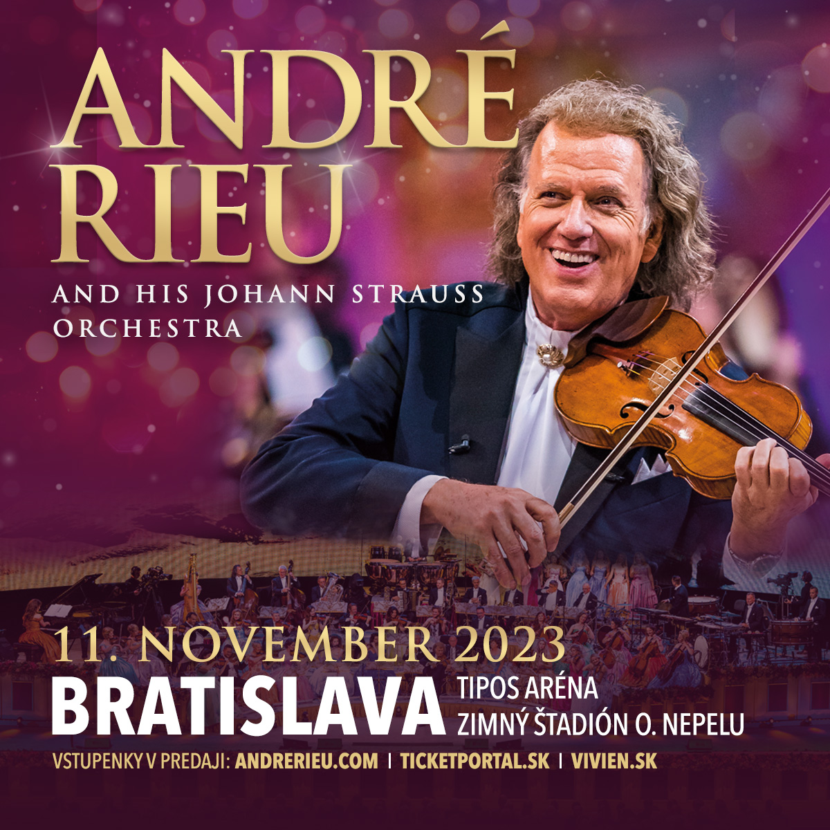 Vstupenky na čerstvo ohlásený koncert André Rieu a Johann Strauss Orchestra, ktorý sa uskutoční v Bratislave 11. novembra 2023, sú dostupné na www.vivien.sk a v sieti Ticketportal.