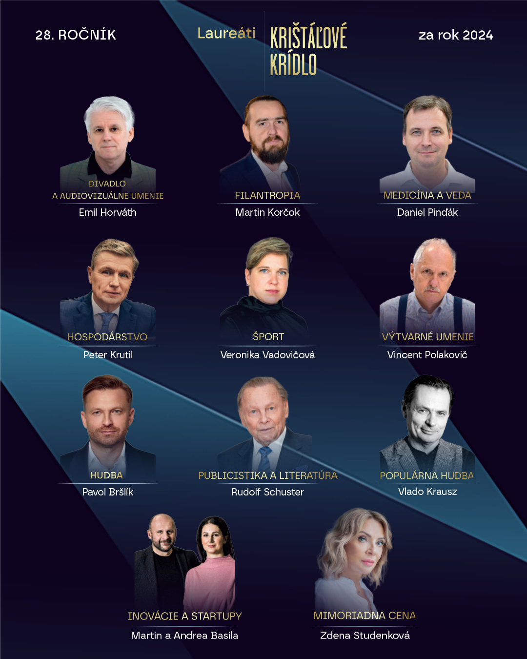 V sobotu 15. marca 2025 sa v Slovenskom národnom divadle uskutočnil 28. ročník udeľovania cien Krištáľové krídlo. Prestížne ocenenie si odniesli výnimoční slovenskí odborníci za svoj prínos v oblasti kultúry, vedy, športu či filantropie. Slávnostný galavečer sledovali diváci v priamom prenose na Jednotke.