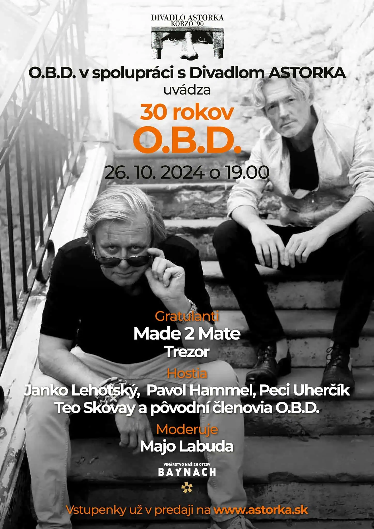Alternatívna rocková kapela O.B.D. je na scéne už neuveriteľných 30 rokov! Hity „Komáre“, „Biely strom“, „Džadžuli Dža“, „Zmoknutý vták“ či „Slnečný deň“ sú dodnes nezabudnuteľné legendy a oslovujú stálych aj nových fanúšikov. Orchester Bronislava Dobrotu sa rozhodol 30. narodeniny osláviť naozaj veľkolepo. V Divadle Astroka chystá pre fanúšikov nezabudnuteľný program, v rámci ktorého sa stretnú pôvodní aj súčasní členovia orchestra. Zablahoželať jej prídu a v programe vystúpia aj také legendy ako Janko Lehotský, Pavol Hammel, Peci Uherčík a ďalší. Moderovať to celé bude Majo Labuda. Nenechajte si to ujsť!