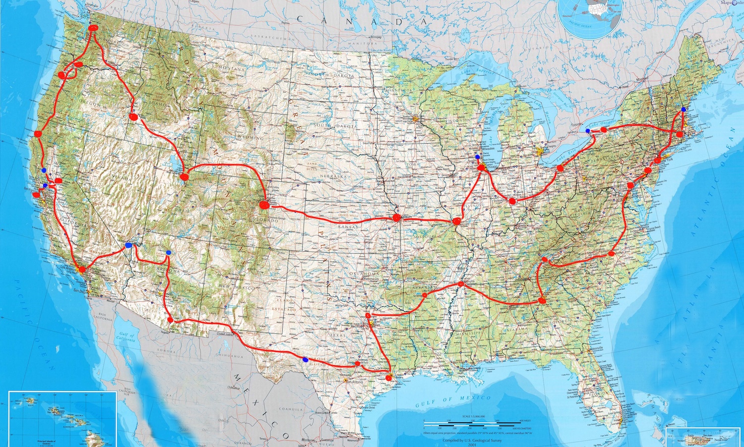 Nejprve bylo v New Yorku nutné vypůjčit si auto a zařídit různé úřední věci. Přepravovat letadlem aparaturu je neekonomické, a tak dalším krokem bylo pořízení nástrojů a hudebního vybavení. Podle kapely je paradoxně levnější si nástroje koupit, než je půjčovat, a tak s pomocí přátel celou sadu nakoupili na internetu a ta na ně čekala v Providence, kde se uskutečnil první koncert. Jejich cesta pak vedla západním směrem po severní části vnitrozemí přes Chicago, Denver, Boise až do Seattlu, nejzápadnějšího a nejsevernějšího bodu tohoto turné. Odtud pokračovali jižně po západním pobřeží přes Oregon a Kalifornii až do San Franciska a pak ještě jižněji do Los Angeles, odkud se jejich směr stočil zpět na východ a postupně přes Arizonu, Texas a Severní Karolinu dojeli zpátky do New Yorku. Během cesty byli každou chvíli v jiném časovém pásmu, ráno u moře, přes den v poušti v tropických teplotách, večer ve velkoměstě a druhý den ráno v horách s teplotami těsně nad nulou.
