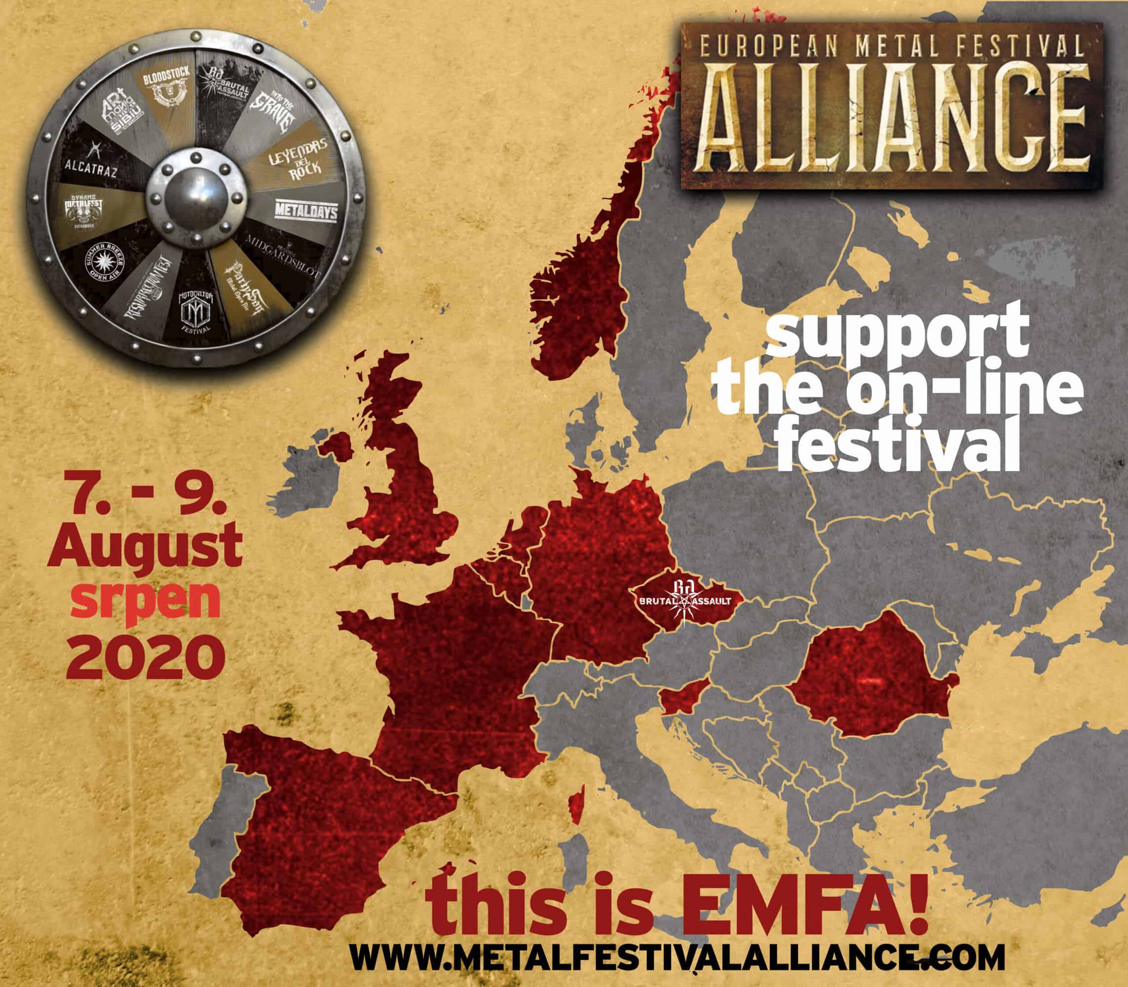 EMFA, Evropská aliance metalových festivalů, je letošní léto de facto jediný fest, na který se ‘tak ňák‘ můžete dostat. Navíc z pohodlí domova. Tenhle unikátní online projekt 13 festivalů z 10 evropských zemí vznikl pro záchranu a rozmělnění letošního nefestivalového léta, které je v tomto období obvykle nabito akcemi. Pokud je pro vás zachování festivalového sektoru v Evropě důležité, dejte EMFA a zúčastněným kapelám svou podporu a spolupodílejte se na přežití nezávislých festivalů, které se virové době postavily společně.