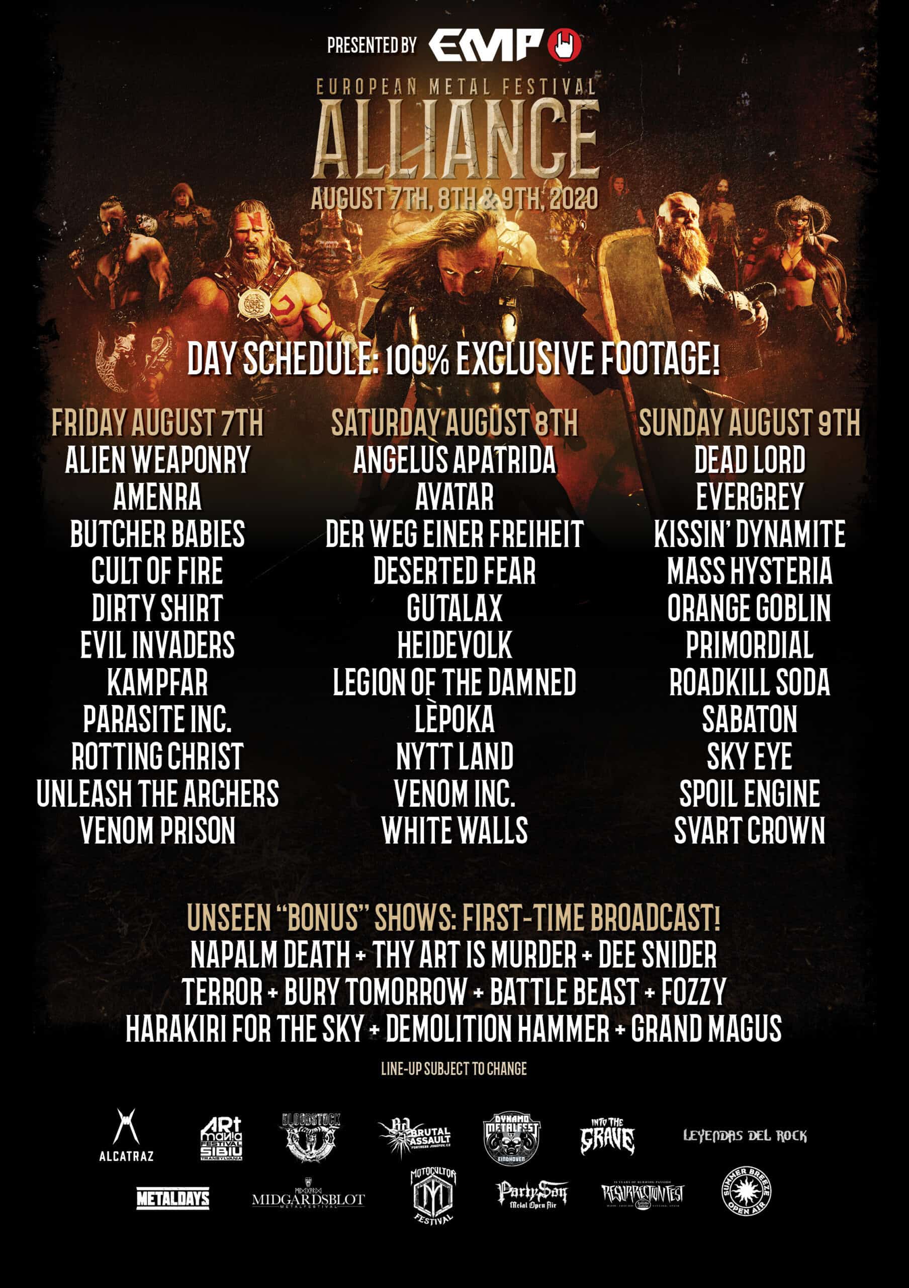 Evropská metalová aliance je společný podnik festivalů Brutal Assault (CZ), Summer Breeze (Německo), Bloodstock (UK), Metal Days (Slovinsko), Motocultor (Francie), Alcatraz (Belgie), Party.San (Německo), Resurrection (Španělsko), Dynamo (Nizozemsko), Into The Grave (Nizozemsko), Leyendas Del Rock (Španělsko), ARTmania (Rumunsko) a Midgardsblot (Norsko).
