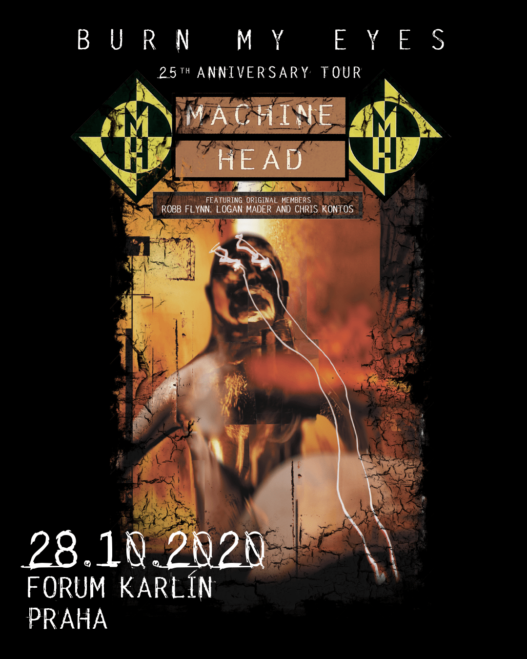 Machine Head, kteří jsou označováni za jednu z nejvýznamnějších metalových kapel současnosti, vznikli v roce 1992 v Oaklandu. Do dnešního dne vydali devět studiových alb, včetně zmíněného „Burn My Eyes“, které svého času způsobilo na metalové scéně revoluci a dodnes je považováno za jedno z nejvlivnějších alb 90.let. K radosti všech příznivců Machine Head dal Robb Flynn vloni dohromady sestavu, která debutovou desku natočila a vyrazil s ní na výroční turné. Aktuální koncerty jsou výjimečné i dramaturgií, která sestává nejen z celého alba Burn My Eyes v podání původních členů skupiny ale i z průřezu další tvorbou kapely, který s Flynnem hrají jeho současní spoluhráči.