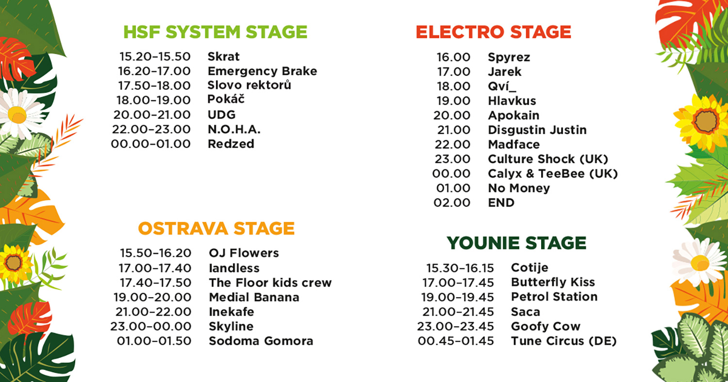 Studenti z VŠB-TUO a Ostravské univerzity si letos přichystali celkem 4 scény (HSF SYSTEM STAGE, OSTRAVA STAGE, ELECTRO STAGE a YOUNIE STAGE). Mezi největší hvězdy, které vystoupí v pátek 13. května patří Pokáč, Iné Kafe, UDG, N.O.H.A., Medial Banana, Redzed nebo Sodoma Gomora.  Velký ohlas tento by tento rok měla vzbudit především ELECTRO STAGE, kde vystoupí britská hvězda Culture Shock nebo duo Calyx & TeeBee.