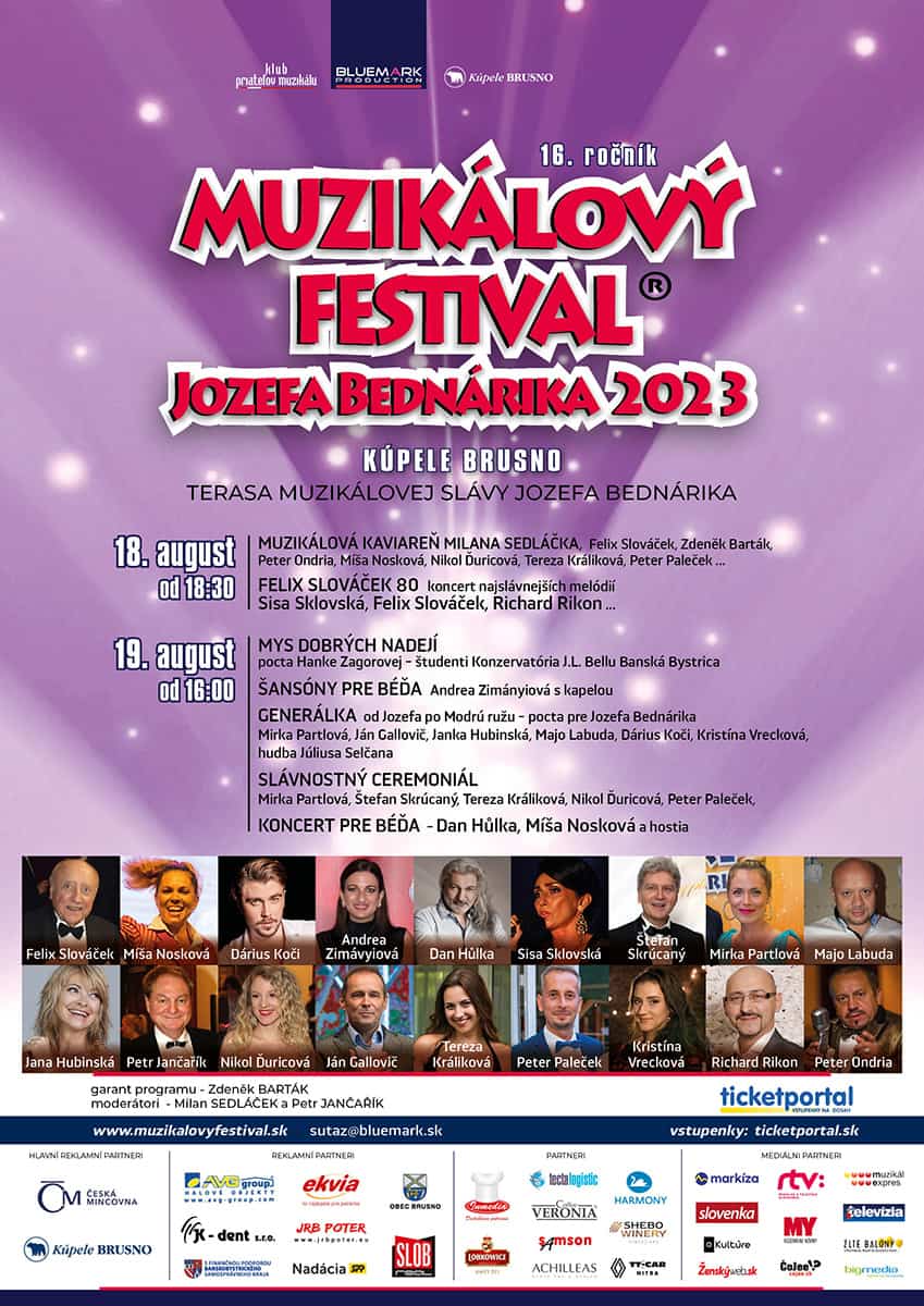 Vstupenky na Muzikálový festival Jozefa Bednárika, ktorý sa uskutoční 18. a 19. augusta 2023 v Kúpeľoch Brusno sú k dispozícii v sieti Ticketportal.sk.