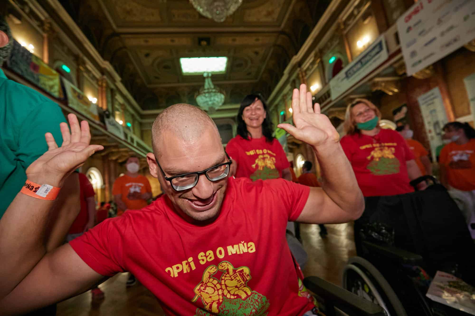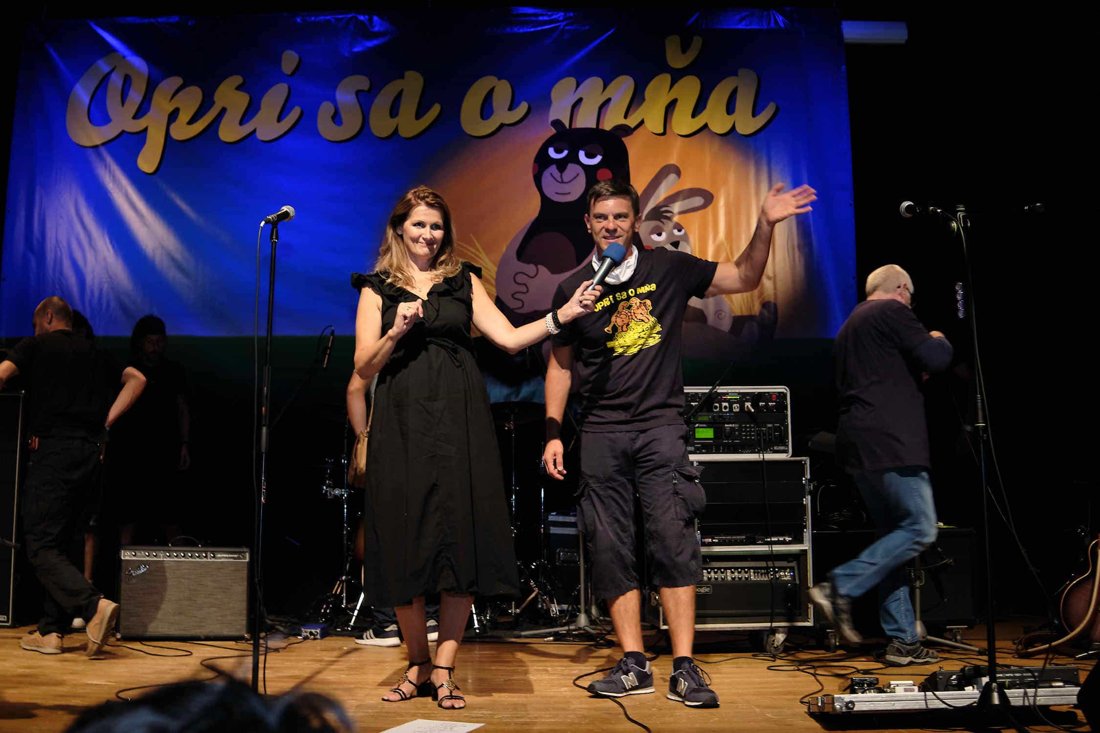 Po tanci si treba trocha oddýchnuť. Na pódium prichádza moderátorka podujatia, Katka Brychtová. A nie je sama. Milan Štefánik spolu s ňou a spoluorganizátorkou podujatia Gabrielou Bačovou v krátkosti zopakujú opatrenia, ktorými sa dnes treba riadiť. „Keď som sem išla, tak som rozmýšľala, že či dokážeme zabezpečiť to, aby bolo všetko bezpečné. Musím povedať, že som veľmi milo prekvapená, preto že naozaj všetci máme rúška.“ A nielen to. Dezinfekčná hliadka v neprehliadnuteľných červených tričkách dezinfikovala stoly, stoličky, ruky.