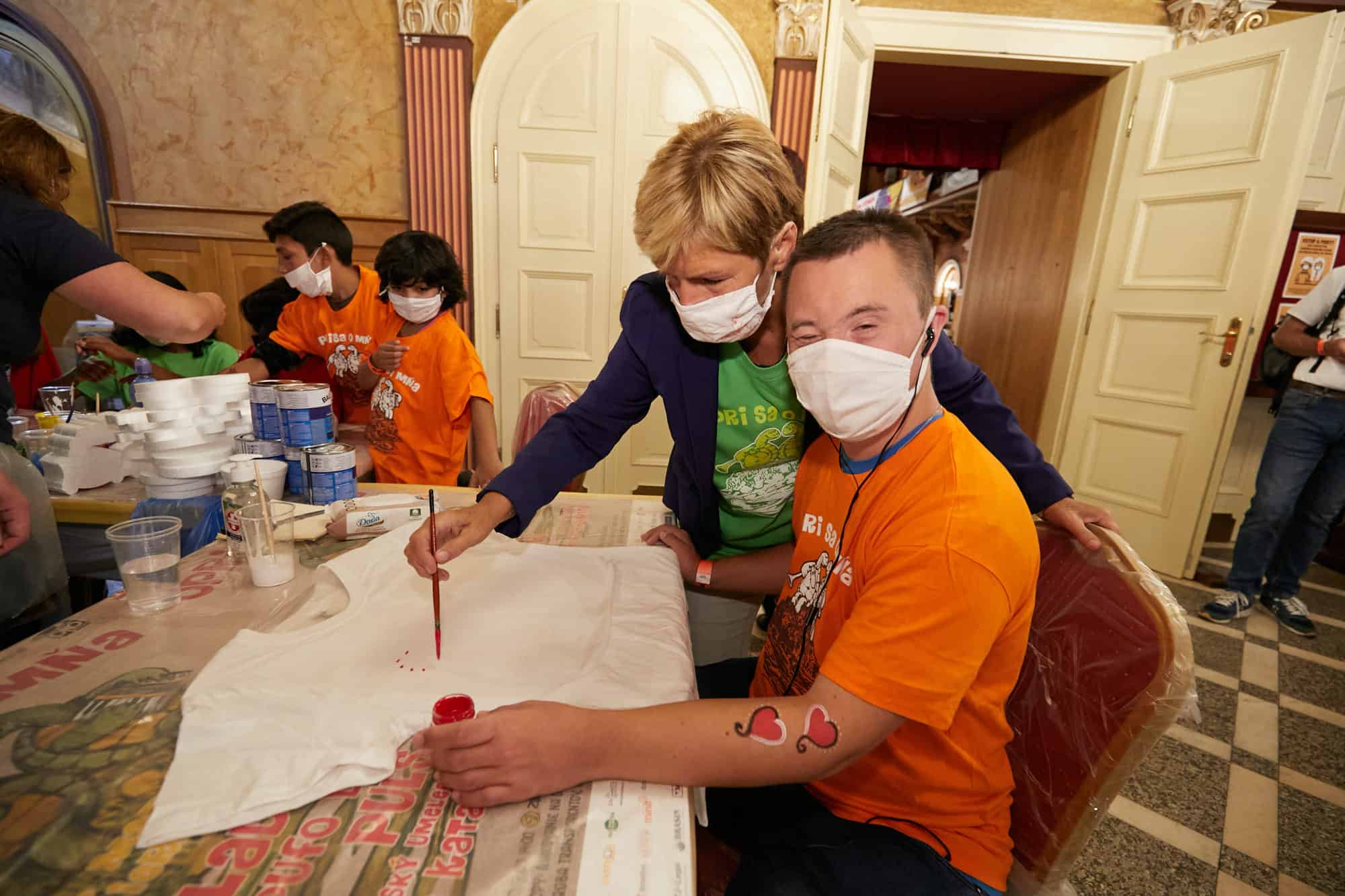 Ale poďme pekne po poriadku. Najprv pripraviť všetko potrebné. Pri dverách stojan s dezinfekčným prostriedkom. Vo foajé vpravo priestor pre farebné tričká. Ktoré si vyberiete? Oranžové, červené, či zelené? Nech je to tu pekne farebné. Vľavo občerstvenie. Chutné kroisanty, pizza či malinovky. Ešte priestor na tvorenie. Maľovanie na tričká, polystyrén. Výroba šperkov z dreva. Enkaustika – maľovanie horúcim voskom. Maľovanie na ruky. Pestrá ponuka. Vstup do hlavnej sály. Na pódiu aparatúry, nástroje. Zavesiť banery. Pripraviť stoličky pre divákov. Rozdeliť úlohy dobrovoľníkom. Hotovo. Práve včas. Veď prví hostia už prichádzajú.