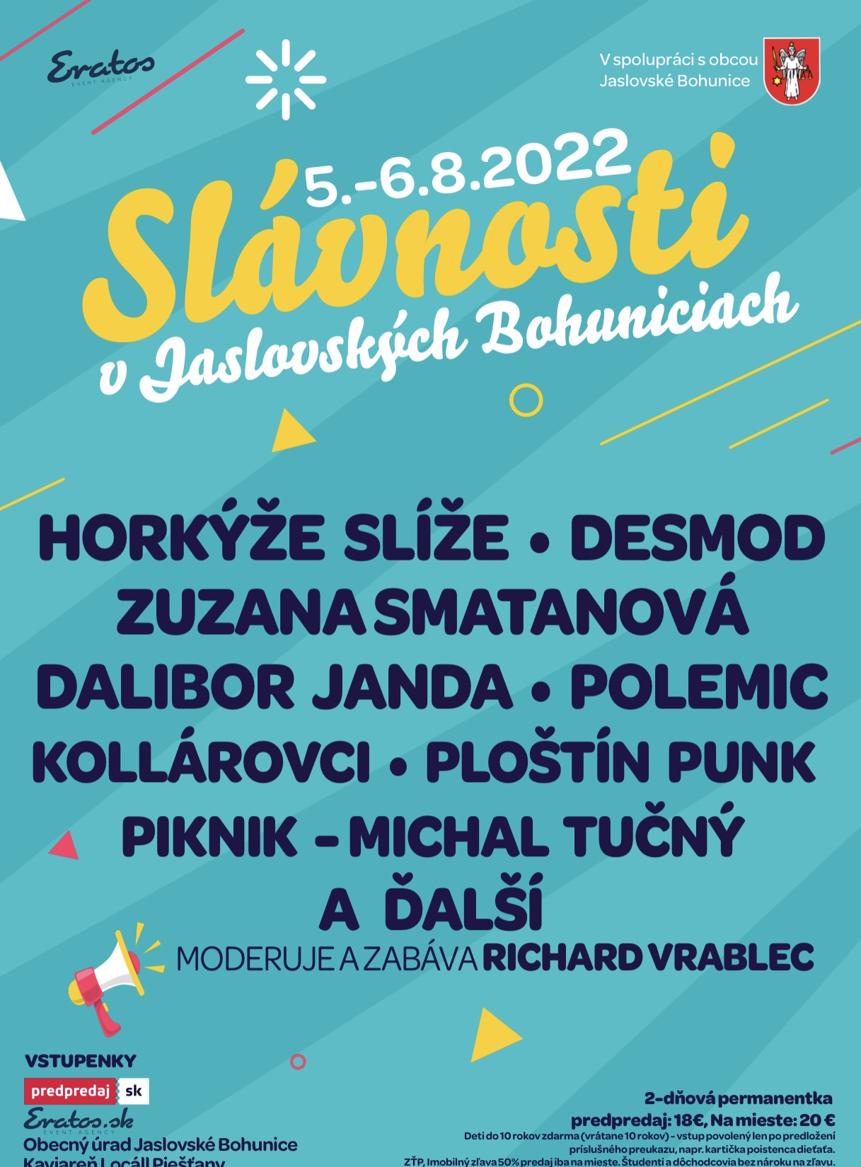 Nenechajte si ujsť výbornú atmosféru, skvelú zábavu a zmes všetkých hudobných žánrov 5. až 6. augusta 2022 na Slávnostiach v Jaslovských Bohuniciach. Vstupenky na festival si môžete kúpiť v sieti Prepredaj.sk https://predpredaj.zoznam.sk/sk/listky/slavnosti-jaslovske-bohunice-2022/ a na Obecnom úrade Jaslovské Bohunice a v kaviarni Lokáll v Piešťanoch.