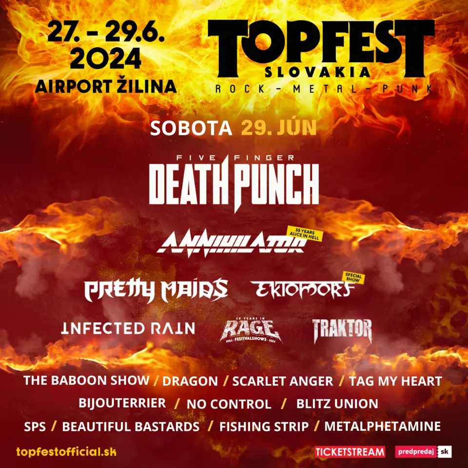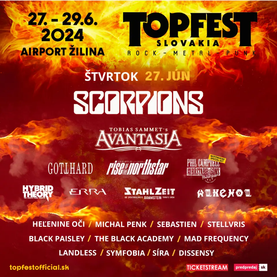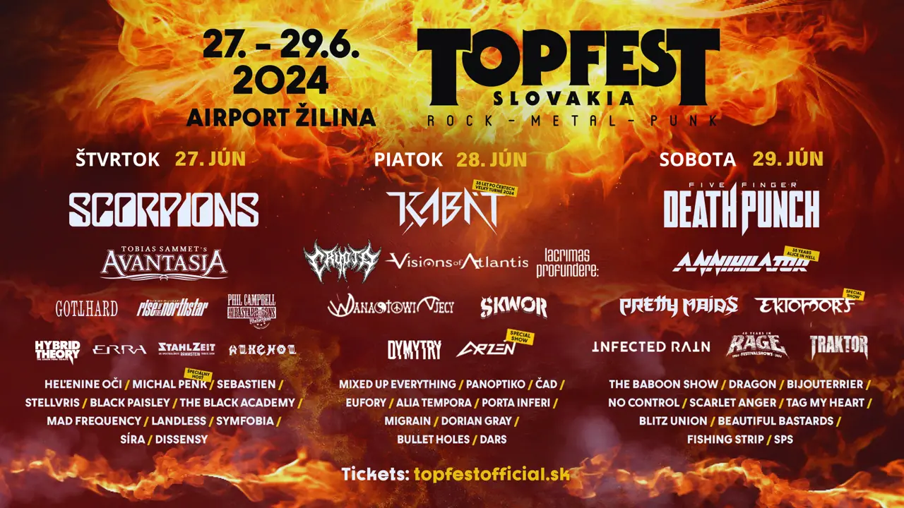Všetci milovníci hudby a festivalovej atmosféry sa môžu tešiť na nezabudnuteľný zážitok na Topfeste 2024, ktorý sa uskutoční na žilinskom letisku v dňoch 27. – 29. júna 2024. Tento ročník prinesie neporovnateľnú hudobnú paletu s vystúpeniami viacerých svetoznámych kapiel.