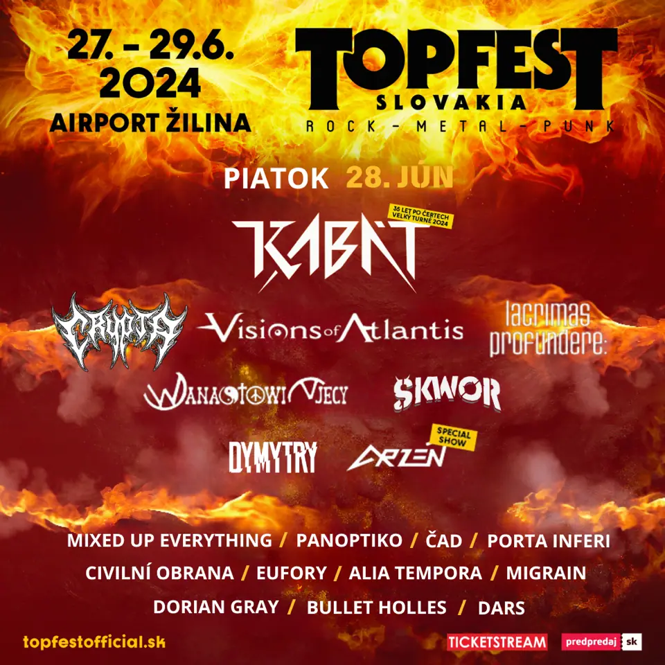 Fanúšikovia českej legendárnej skupiny KABÁT sa môžu tešiť na ich špeciálnu show, ktorú odohrajú druhý festivalový deň 28. júna, v rámci svojho 35 LET PO ČERTECH VELKÝ TURNÉ. A samozrejmosťou je, že nemôžu chýbať ani na Topfest 2024! Pripravte sa na jedinečný rockový zážitok! Na čo sa teda môžete tešiť? Kapela sa snaží stále posúvať technické vymoženosti koncertov a aj teraz tomu nebude inak. Okrem už zavedeného štandardu špičkových pyroefektov sa na scéne objavia aj hydraulické a motorizované prvky, ktoré dokážu rozhýbať a premeniť celú scénu.