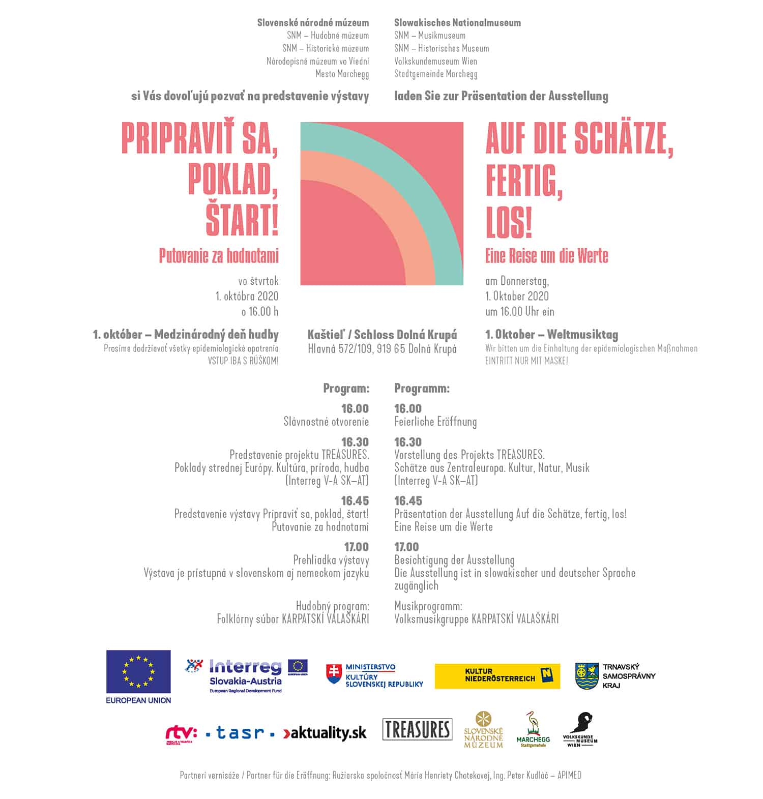 Slovenské národné múzeum (SNM – Hudobné múzeum a SNM – Historické múzeum), Národopisné múzeum vo Viedni a mesto Marchegg pozývajú vo štvrtok 1. októbra 2020 o 16.00 h do kaštieľa v Dolnej Krupej, na predstavenie putovnej výstavy Pripraviť sa, poklad, štart! Putovanie za hodnotami, ktorá je spoločným výstavným projektom inštitúcií v rámci projektu TREASURES. Poklady strednej Európy. Kultúra, príroda, hudba (Interreg V-A SK–AT). Výstava v slovenskom a nemeckom jazyku prezentuje viac ako 200 zbierkových predmetov z troch spomenutých múzeí regiónu.