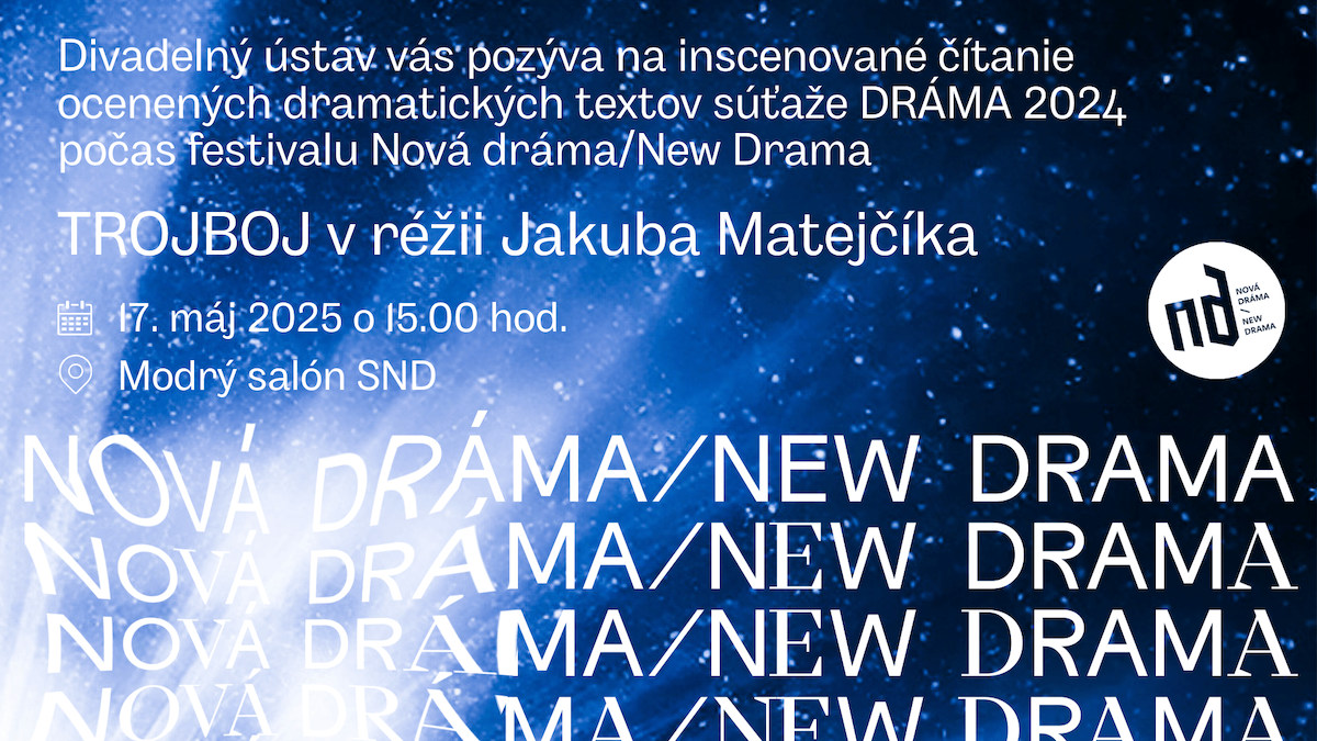 „Ocenené dramatické texty vyjdú v elektronickom zborníku, vďaka ktorému budú diela prístupné aj divadelným tvorcom a širokej verejnosti. Víťaz či víťazka získa finančnú prémiu 1 000 eur. Kto to bude, sa dozvieme v sobotu 17. mája 2025 počas záverečného ceremoniálu festivalu Nová dráma/New Drama v Štúdiu 12,“ priblížila koordinátorka súťaže Anna Šoltýsová a verejnosť zároveň pozvala na podujatie Trojboj, ktoré sa uskutoční v rovnaký deň počas festivalu a vstup naň bude voľný: „V Modrom salóne Slovenského národného divadla uvedieme v sobotu 17. mája o 15.00 hod. úryvky ocenených textov. Profesionálny divadelný tím pod vedením režiséra Jakuba Matejčíka ich na javisko prenesie vo forme inscenovaného čítania za osobnej účasti ocenených, ako aj poroty. Po ňom bude nasledovať diskusia. Podujatie je vhodné pre kohokoľvek, kto sa zaujíma o divadlo, literatúru či nové trendy v súčasnej autorskej tvorbe.“
