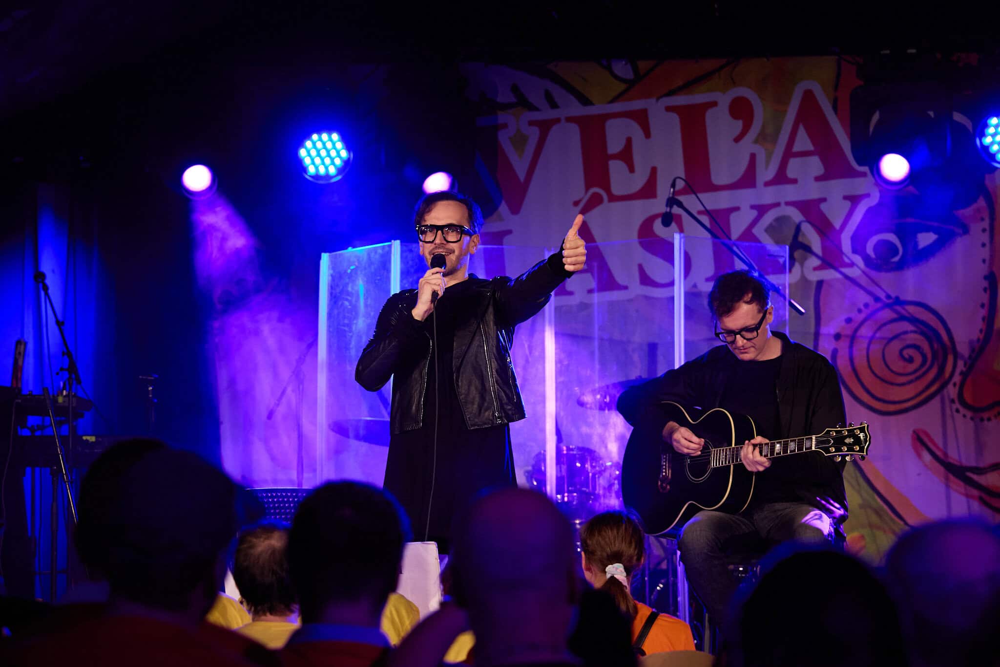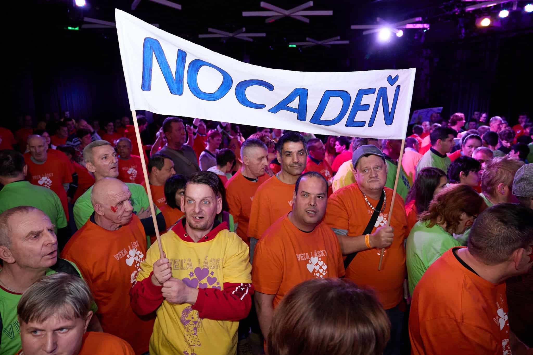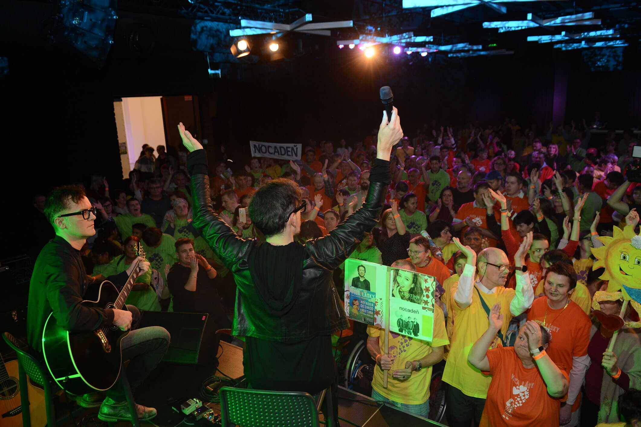 Len na skok od domu si odbehli do Kulturparku chalani z Nocadeň. Bratia Rasťo a Robo Kopinovci. 25. decembra budú oslavovať výročie založenia kapely. A koľké to bude. Skúste si to spočítať. Fungujú na Slovenskej rockovej scéne od roku 1997. Na svojom konte za ten čas majú tiež niekoľko ocenení. Pohoda s gitarou na pódiu a ich piesne. A v sále „inak obdarení“ pripravení spievať s chalanmi. Transparenty pripravené. „Tie transparenty a to všetko, čo si pre nás pripravili, je veľmi milé. Je to veľmi príjemné a som dojatý.“ Ako čierny Havran sa do sály znieslo prítmie. Ani Steny nezábrania tomu, že je počuť spev po celých priestoroch Kulturparku. Slová zo života. Slová už nevravia nič. Alebo predsa len niečo. O láske. Veď tá je dnes aj v názve akcie. Krásne Svitanie. A poslednú si dáme znova v prítmí. Pod lampou. „Hralo sa nám veľmi dobre, preto že tí ľudia sú veľmi muzikálni. Cítia rytmus a keď k nim príde človek, ktorý ich má úprimne rád a úprimne sa k nim prihovorí, tak mám pocit, že oni to vedia vycítiť a potom tú lásku vedia vrátiť.“ Opäť veľký potlesk a už sa náručie chalanov Kopinovcov plnia darčekmi od detí.