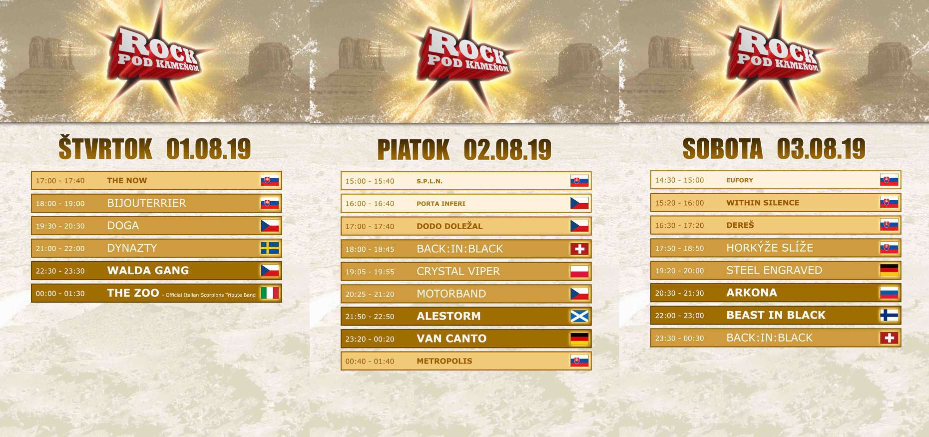 O program Rock pod Kameňom, ktorý patrí medzi najväčšie a najlepšie festivaly na Slovensku sa postará BEAST IN BLACK, ARKONA, ALESTORM, VAN CANTO, DYNAZTY, CRYSTAL VIPER, STEEL ENGRAVED, BACK:N:BLACK, THE ZOO, MOTORBAND, DOGA, WALDA GANG, HORKÝŽE SLÍŽE, BIJOUTERRIER, METROPOLIS, DEREŠ a mnoho ďalších.