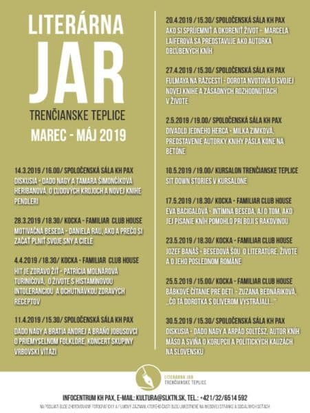V kúpeľnom meste Trenčianske Teplice začal 14. marca festival Literárna jar, ktorý je súčasťou celoročného konceptu mesta Kultúra a noblesa. Návštevníkov počas 3 mesiacov čaká 12 rozhovorov, diskusií a divadiel s kvalitnými umelcami slovenskej literárnej scény.