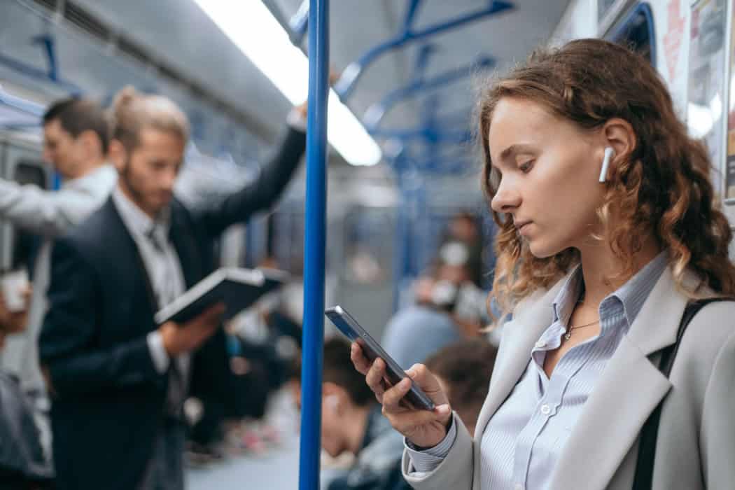 close up. young woman reads a text message on a subway train.