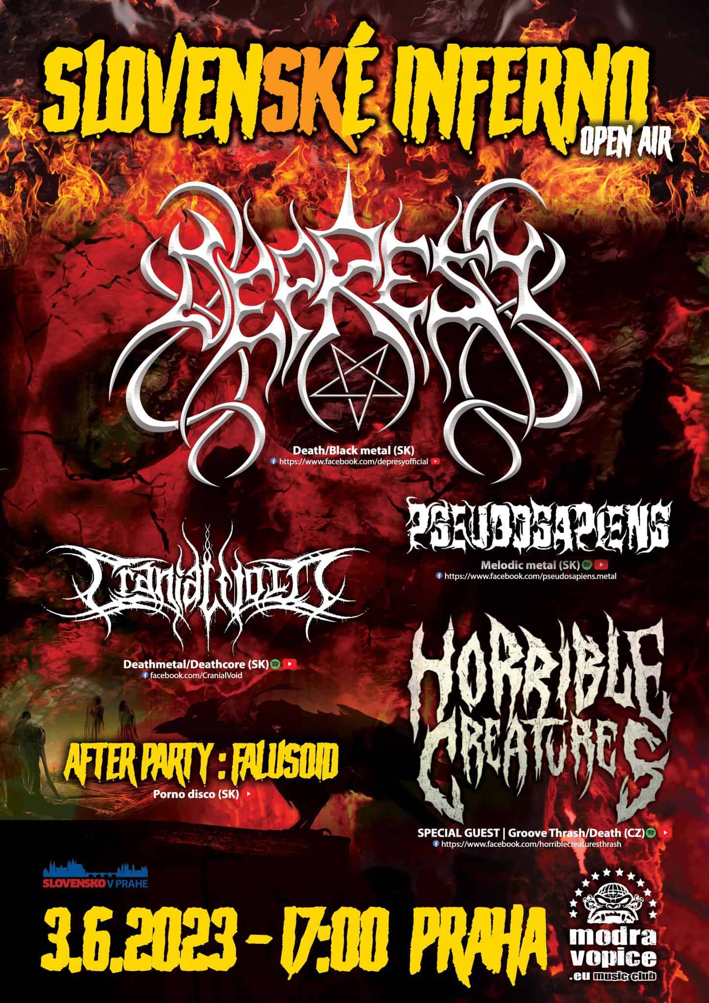 Už za niekoľko dní (3.6.) sa otvoria brány známeho pražského klubu Modrá Vopice, kde sa v rámci prvého ročníka Slovenského inferna predstavia kapely DEPRESY, CRANIAL VOID a PSEUDOSAPIENS. Českým hosťom bude HORRIBLE CREATURES s dvoma Slovákmi v zostave. Večer uzavrie v rámci after párty gitarista PSEUDOSAPIENS so svojím porno-disco projektom FALUSOID.