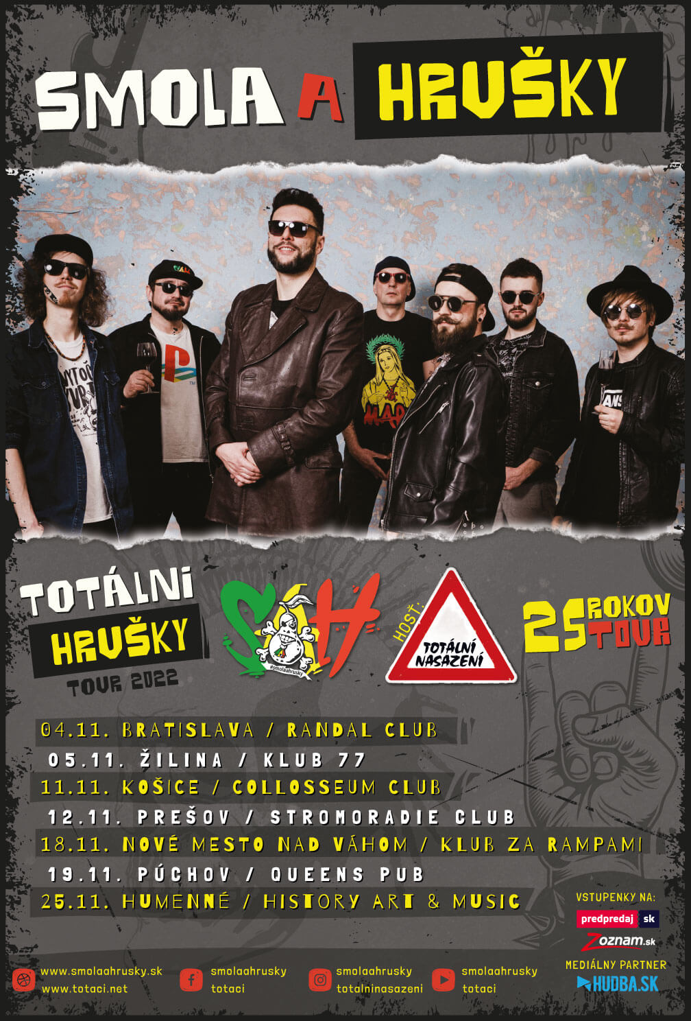 Kapela Smola a Hrušky oslavuje 25. výročie svojho vzniku a pokračuje v česko-slovenskom klubovom turné s názvom Totální Hrušky tour / 25 rokov Smola a Hrušky. Po dvoch rokoch núteného preloženia to do tretice vyšlo. Ako hosť sa v rámci slovenských zastávok predstaví česká legenda z mesta Slaný, kapela Totální Nasazení, ktorá pôsobí obdivuhodných 32 rokov na českej punk-rockovej scéne.