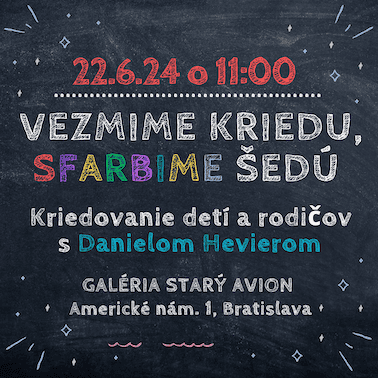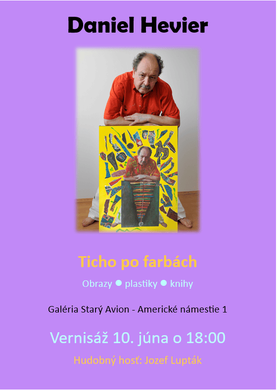 Snáď každý malý aj dospelý čitateľ pozná diela spisovateľa Daniela Heviera. Málokto však vie, že sa už dekády venuje aj výtvarnému umeniu. Na predajnej výstave Ticho po farbách v Galérii Starý Avion na Americkom nám. 1 otvorí pomyselné dvere svojho ateliéru a odhalí niekoľko svojich obrazov, plastík a unikátnych autorských kníh. Návštevníkom Galérie budú Hevierove diela sprístupnené od 10. do 23. júna 2024. S autorom sa budú môcť stretnúť 19. júna o 18:00 na komentovanej prehliadke a 22. júna o 11.00 h na spoločnom maľovaní kriedou pred Galériou Starý Avion.