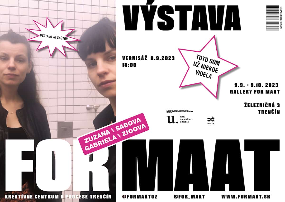 Výstava Toto som už niekde videla v kreatívnom centre For maat, autoriek Zuzany Sabovej a Gabriely Zigovej (alebo Zuzany Zigovej a Gabriely Sabovej?) reflektuje problematiku osobnej aj autorskej identity v dobe umelej inteligencie (Artificial Intelligence – AI) a v opozite k tomu aj hĺbku, povahu a neumelú autenticitu medziľudských vzťahov v rámci hodnôt ako sú priateľstvo a spolupráca.